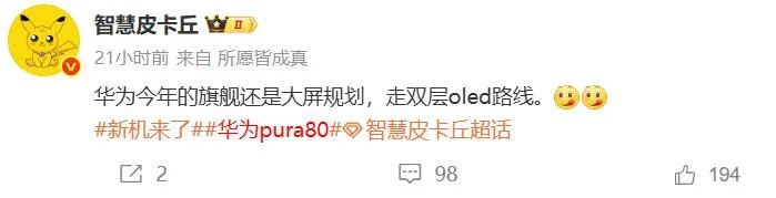 根据知名数码博主@智慧皮卡丘的最新爆料,这次华为Pura80系列采用大屏幕的升级策略,而且全系都会配备双层OLED面板。