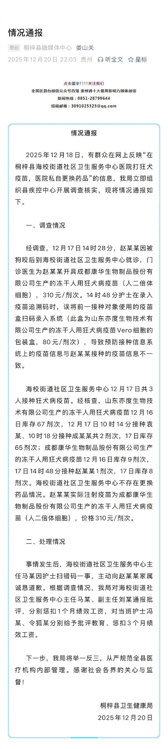12月20日,贵州桐梓县卫生健康局发布情况通报:2025年12月18日,有群众在网上反映“在桐梓县海校街道社区卫生服务中心医院打狂犬疫苗,医院私自更换药品”的信息,我局立即组织县疾控中心开展调查核实,情况通报具体内容如下。