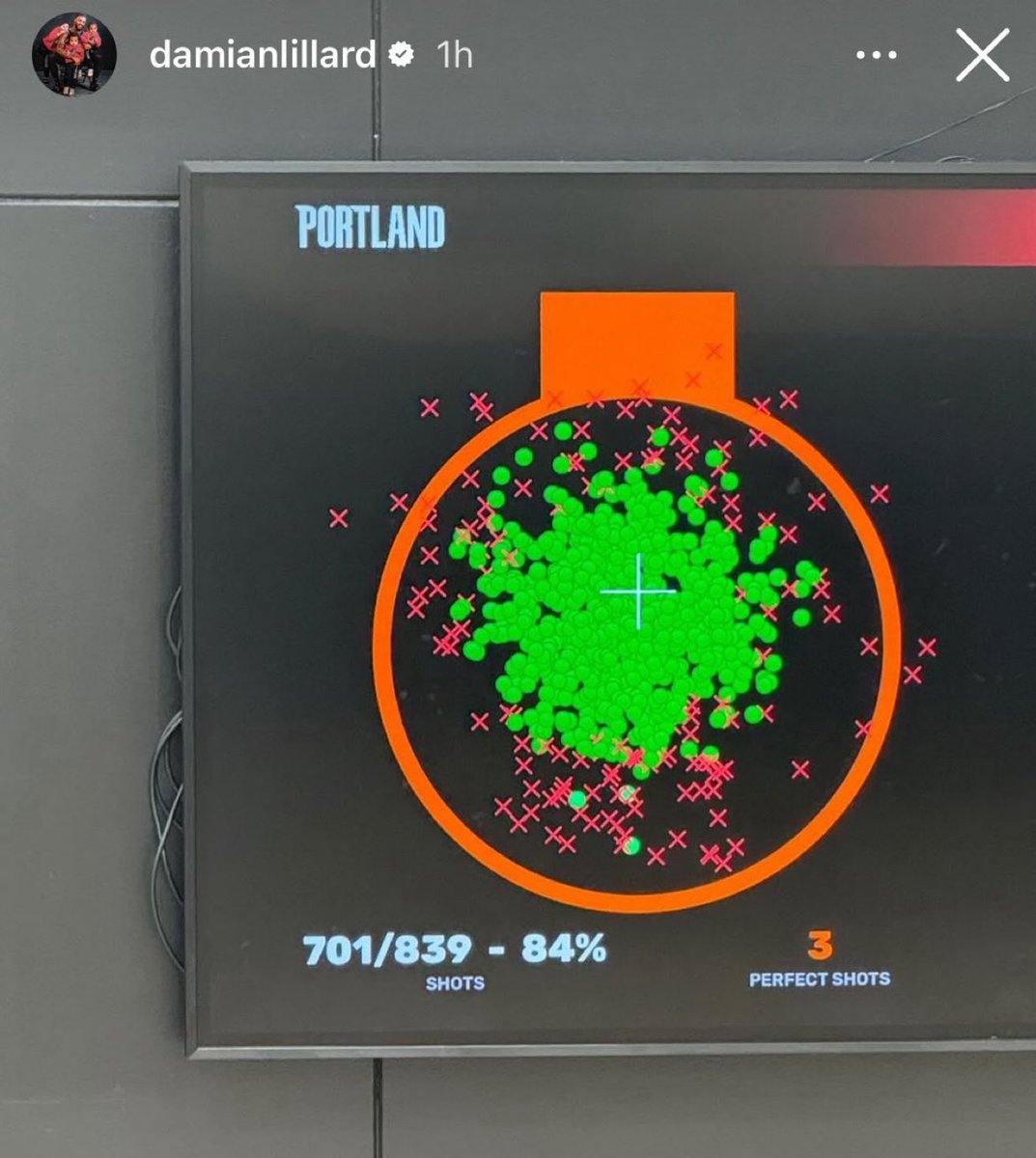 虎扑12月21日讯近日,开拓者球员达米安-利拉德更新了自己的INS快拍,晒出了自己在投篮训练中的命中率(701/839,84%)。