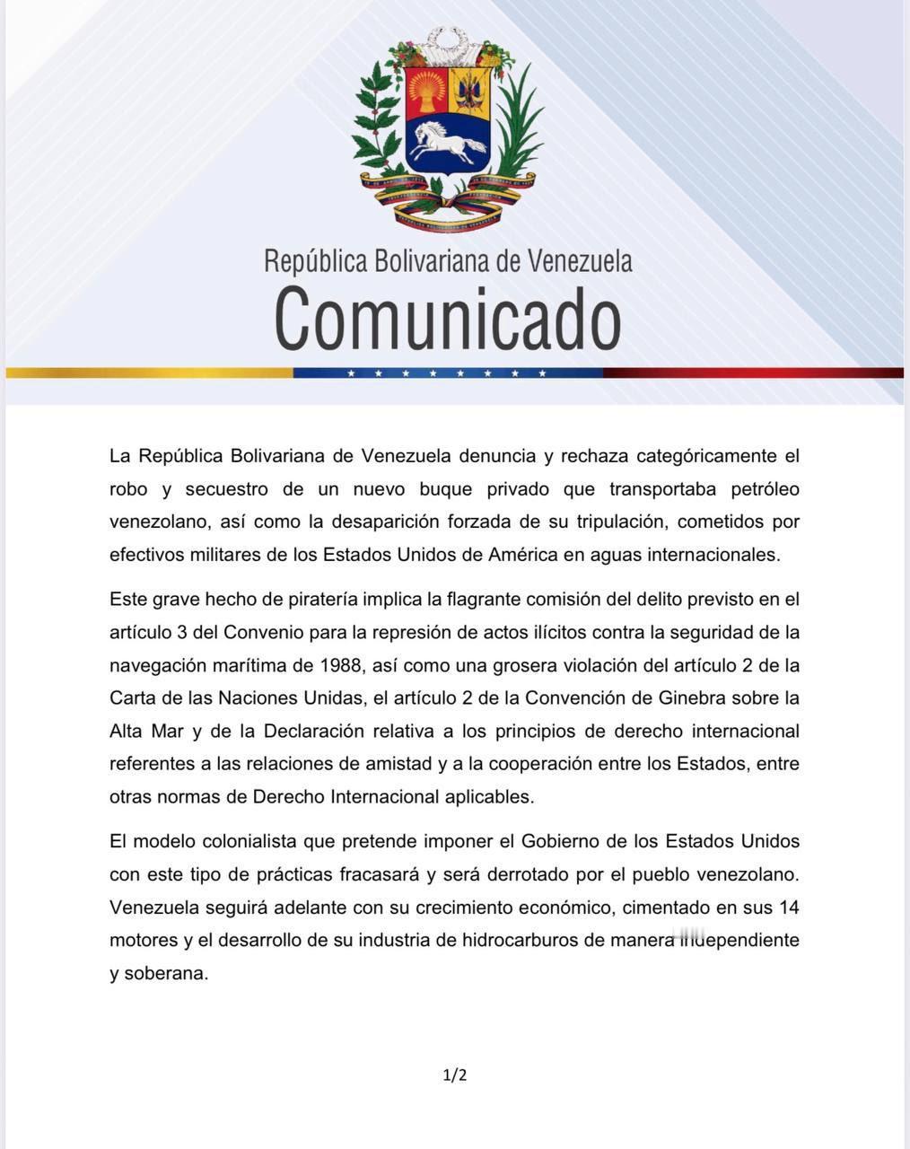 新闻快讯——委内瑞拉政府将美国再次截获一艘油轮的行为定性为“抢劫与劫持”,并称“
