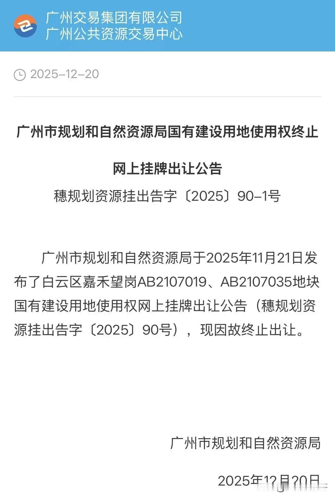 临近收官,广州土拍市场来了个急刹车! 原定于今天竞拍的嘉禾望岗地块、南浦东乡地块,因故终止出让,双双下架,只能等来年再战了! 经历了前几天白云新城、南泰路竞拍的小高潮,最后这几个地块却相继出现无人报名的情况,实在是有点出乎意料。不过也刚好给明年的广州土拍市场提个醒,相比整天画大饼、博规划的,需要深耕、慢慢培育价值的板块,那些“现成” ,所见即所得,确定性高的板块,未来将会受到更多的青睐。