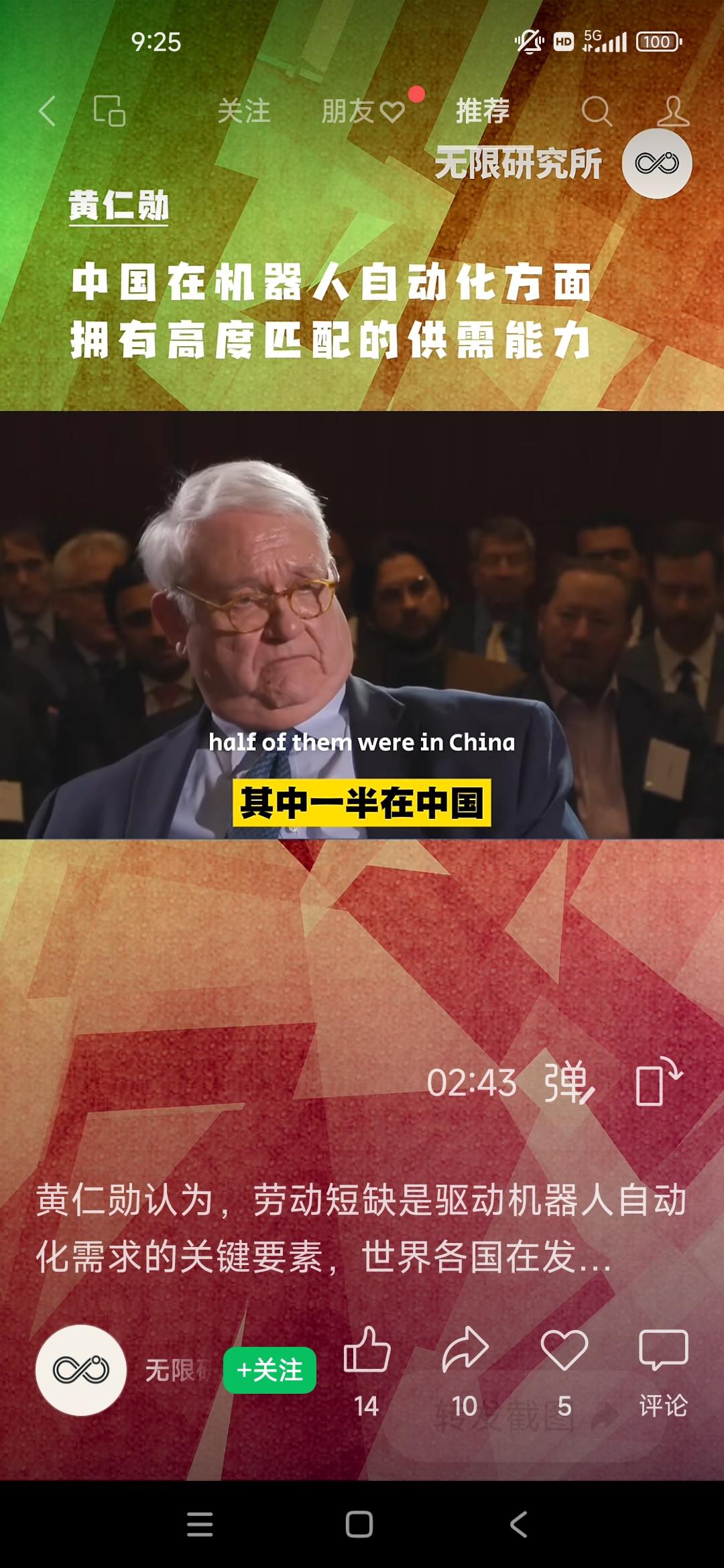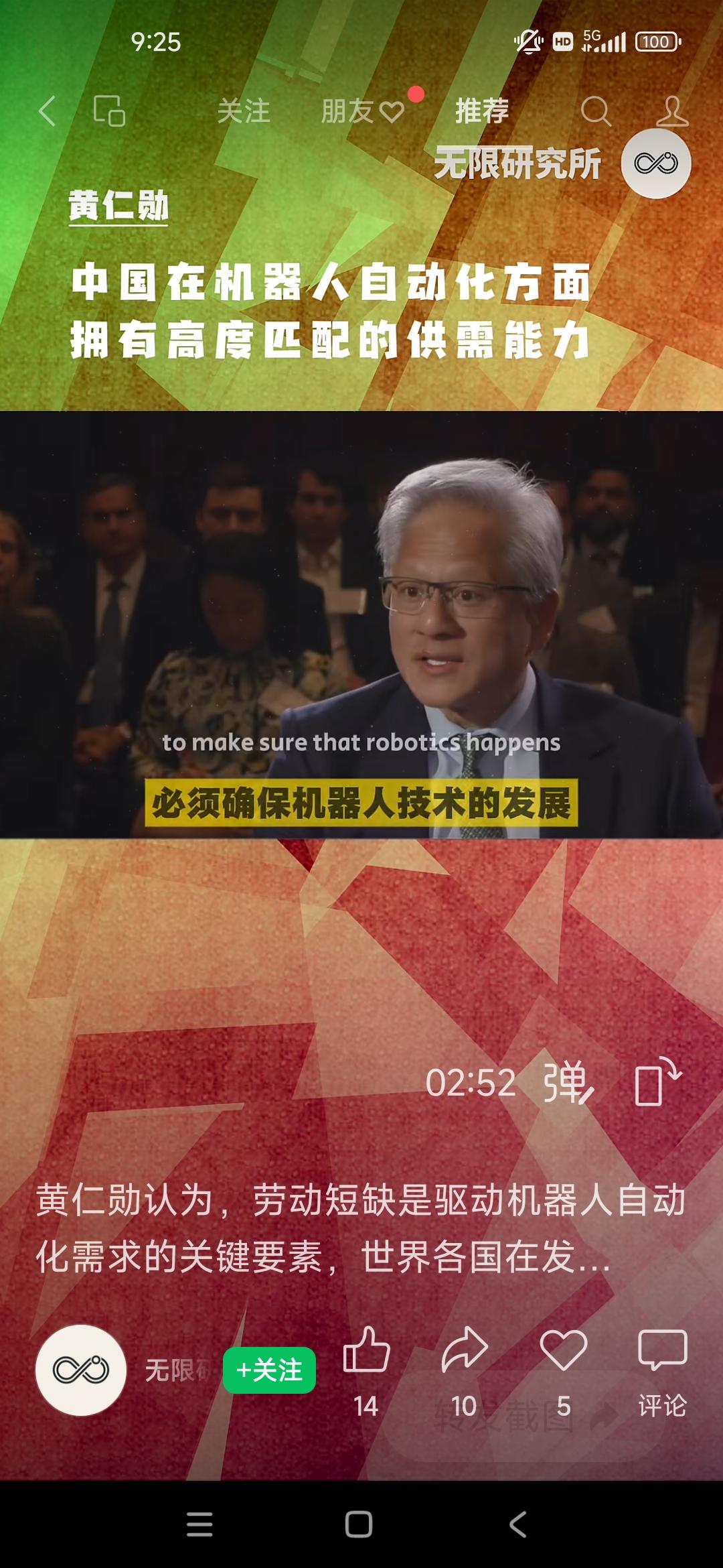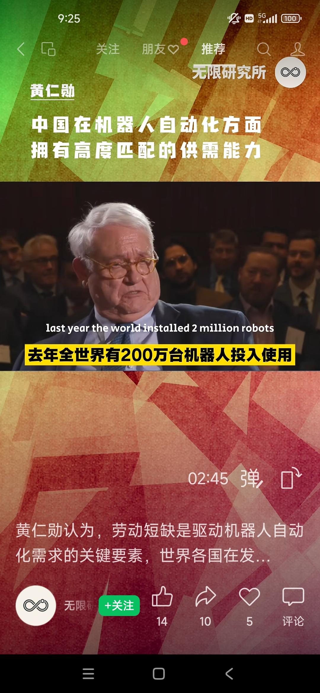 黄仁勋:中国在机器人自动化方面拥有高度匹配的供需能力。 AI机器人就在眼前,已经有证据表明这项技术是可行的,在这方面中国是非常擅长的,为什么呢? 第一,中国有巨大的需求,因为他们的制造业是核心。 第二,中国拥有AI技术。 第三,中国擅长电子与机械的交叉领域,也就是机电一体化。