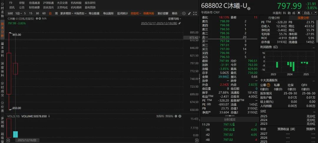 12月17日,沐曦股份上市后,备受投资者追捧,盘中股价最高涨幅755%,收盘上涨692.95%,股价报收829.9元,市值突破3000亿元。即使18日股价下跌之后,截至18日上午收盘,股价为797.99元。