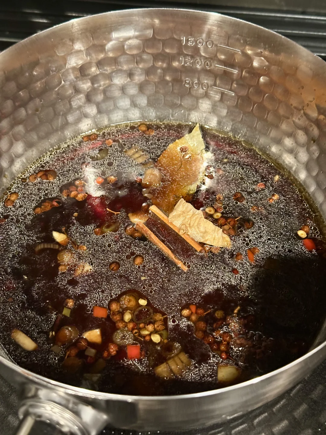 把除花雕酒以外所有材料煮开,小火十分钟,再加花雕酒煮开,常温放凉,