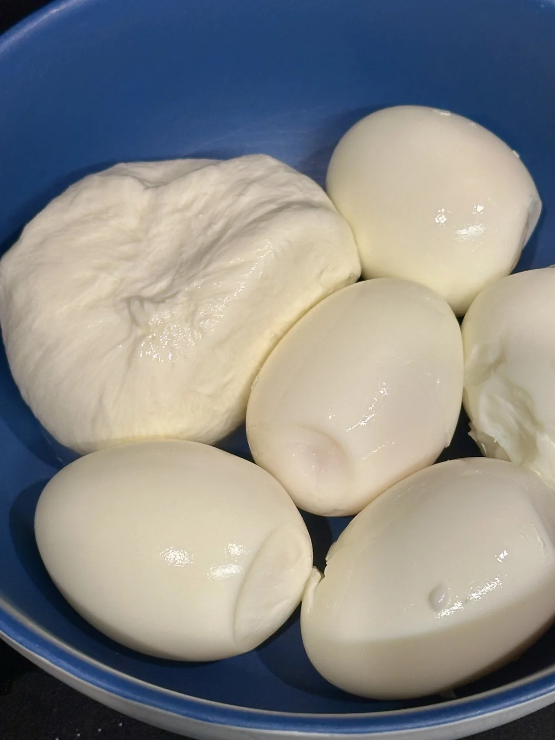 鸡蛋滚水煮7分钟后冷水冲洗,剥皮后放进容器,Burrata也小心地放进容器,