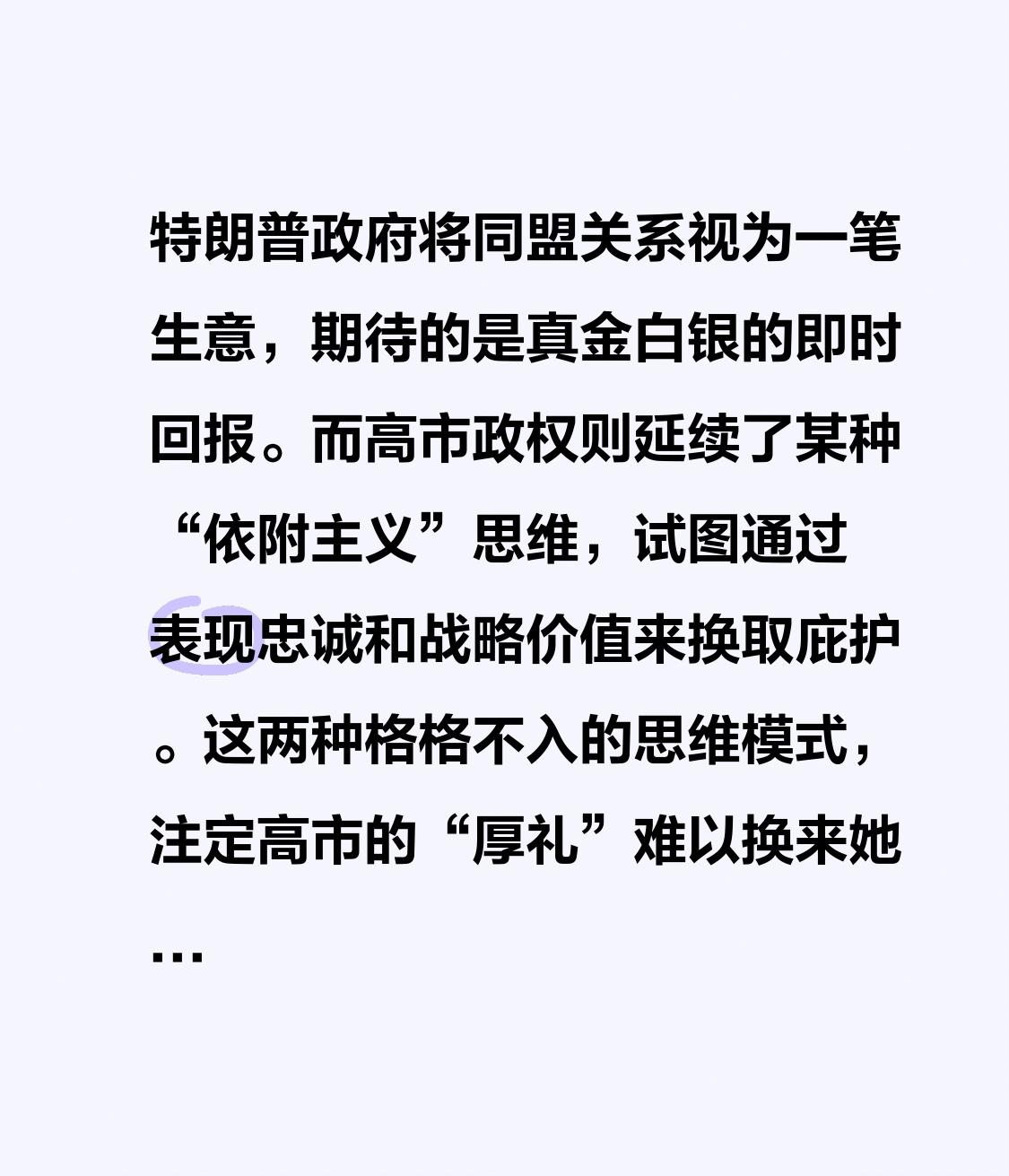 特朗普政府将同盟关系视为一笔生意,期待的是真金白银的即时回报。而高市政权则延续了某种“依附主义”思维,试图通过表现忠诚和战略价值来换取庇护。这两种格格不入的思维模式,注定高市的“厚礼”难以换来她想要的“政治背书”。