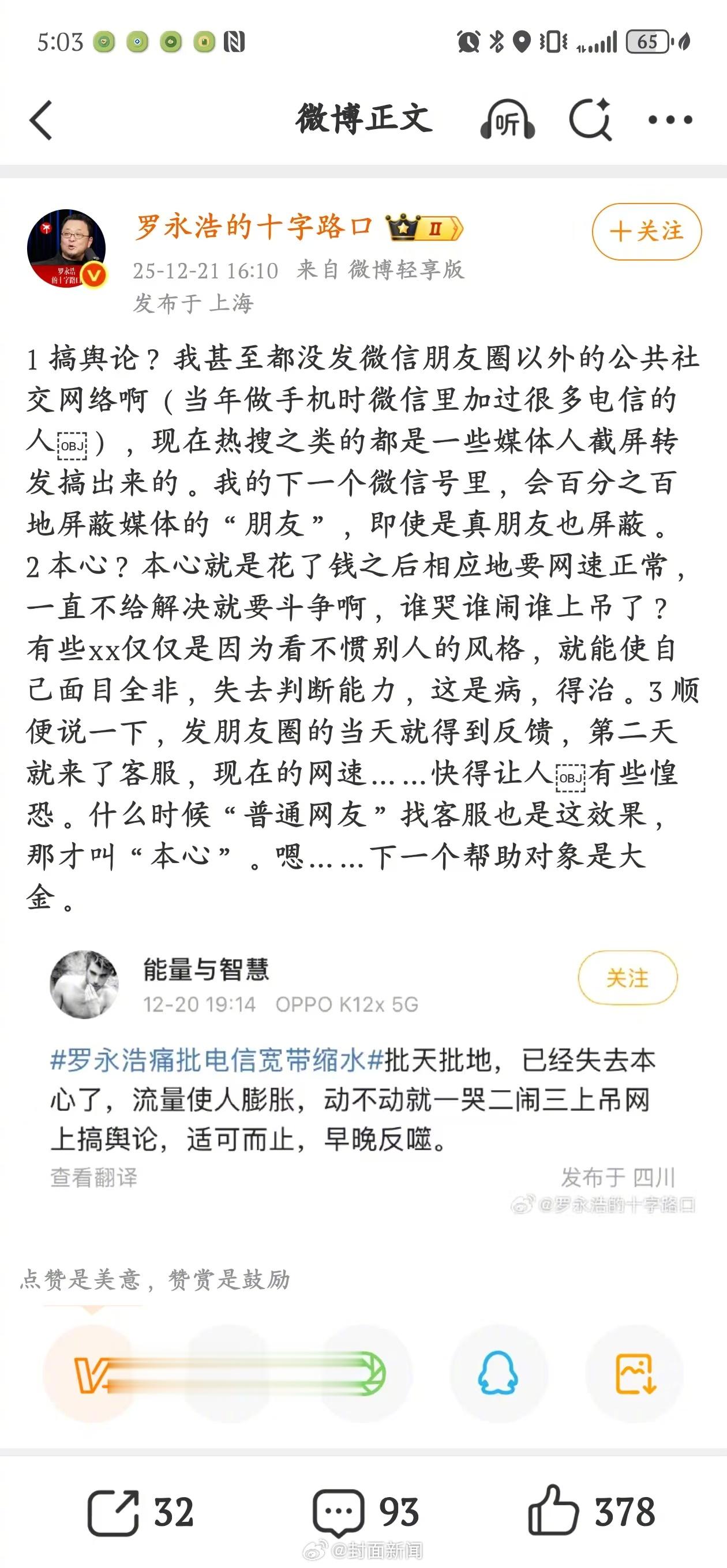 [#罗永浩吐槽后网速快到惶恐#]#罗永浩反问谁哭谁闹谁上吊#12月21日,罗永浩针对网传“靠舆论维权”一事作出回应。他表示,相关内容仅发布在微信朋友圈,并未发布至公共社交平台。
