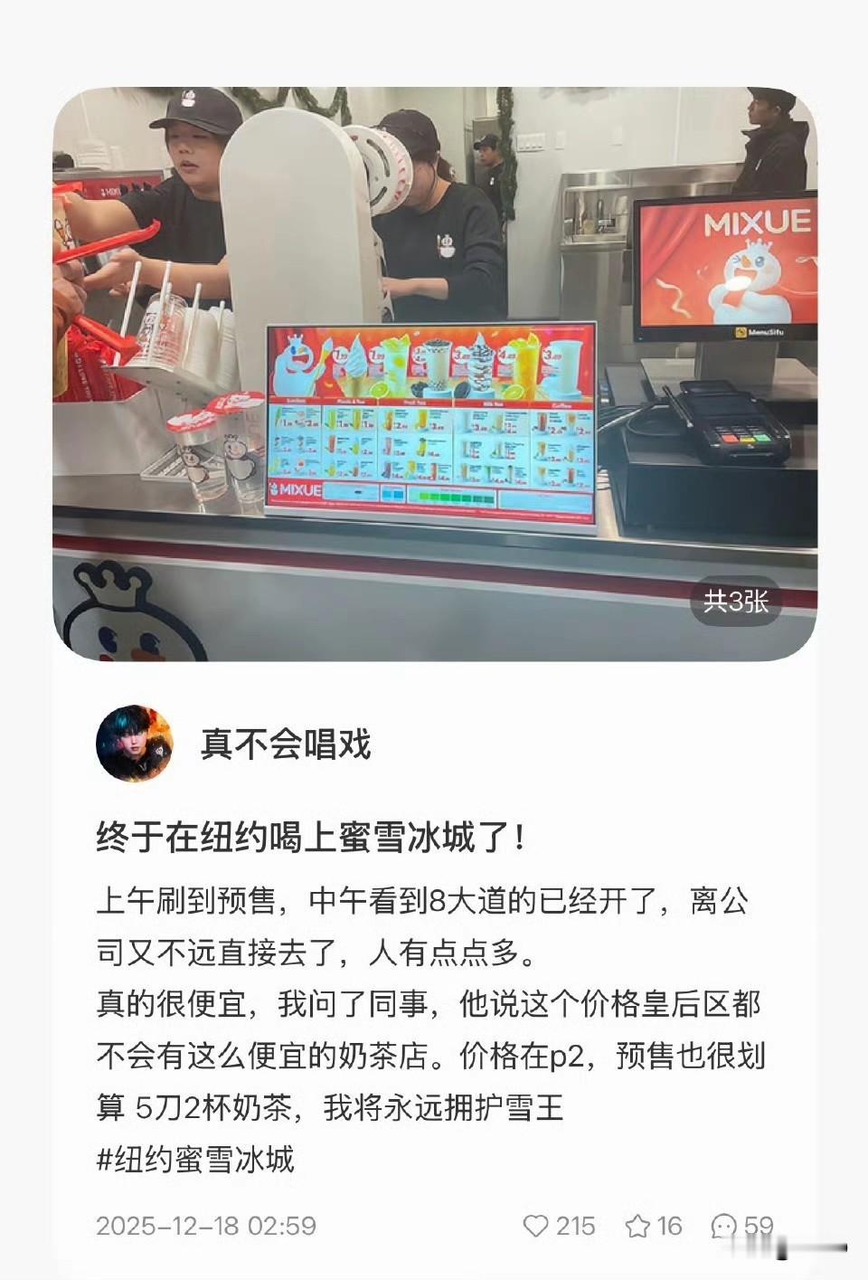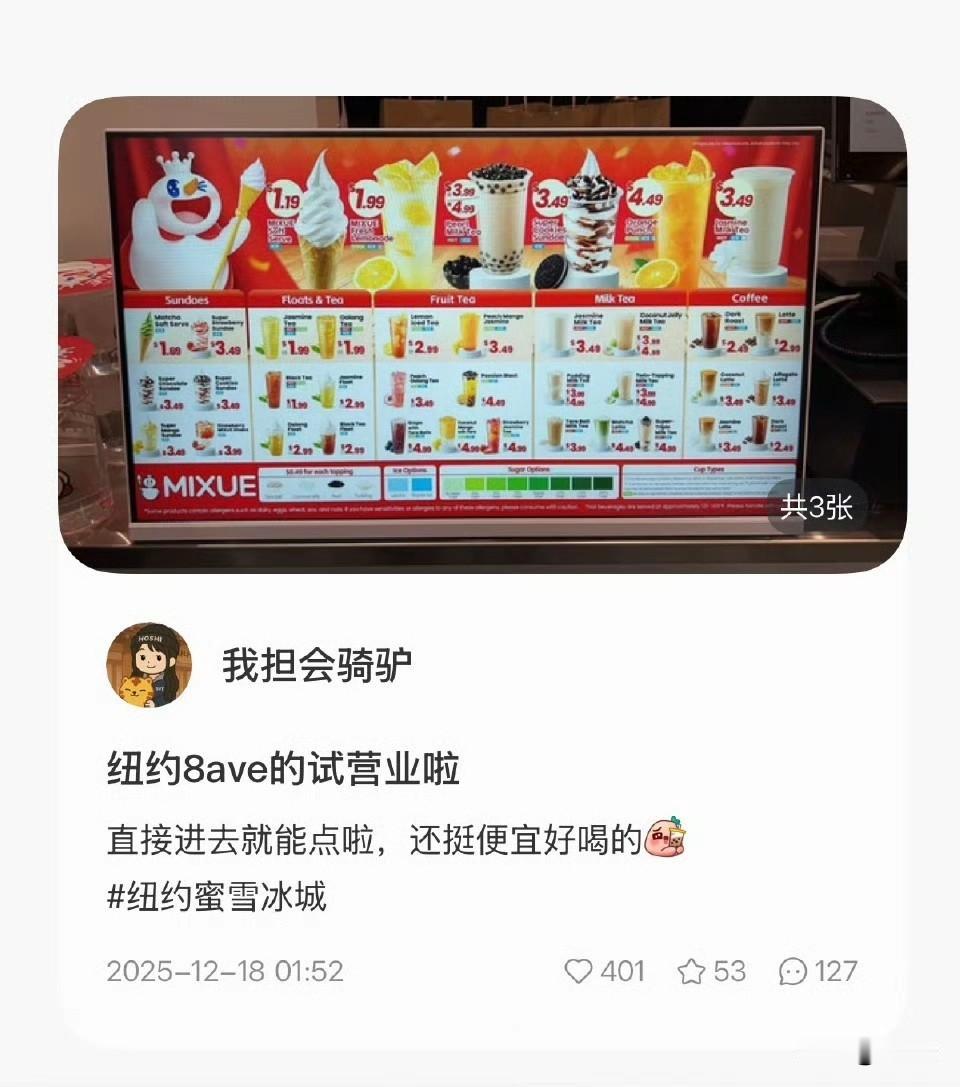 纽约蜜雪冰城的价目表来了……作者图2、3,预售价5刀两杯奶茶。
