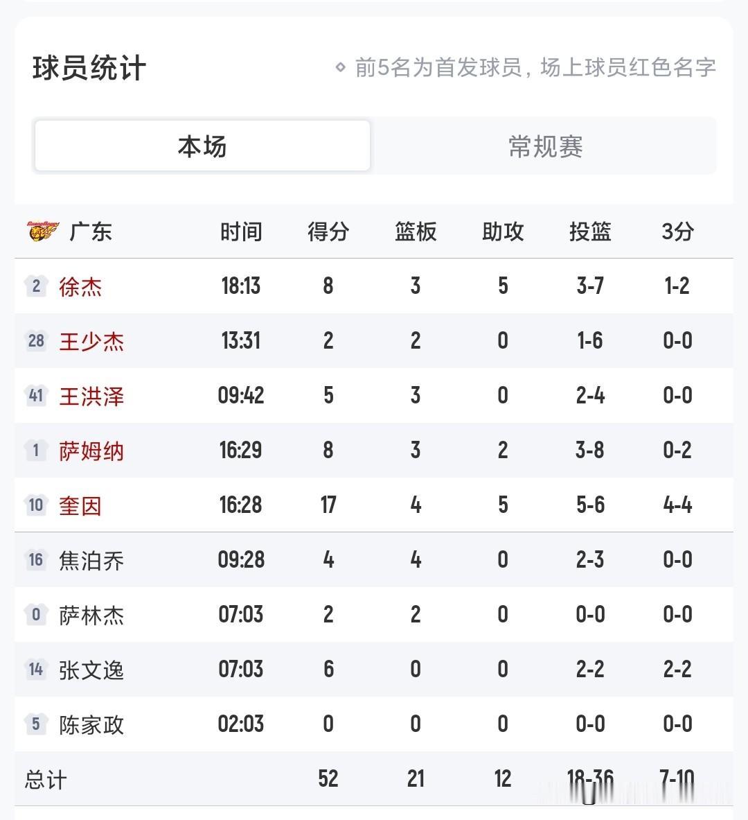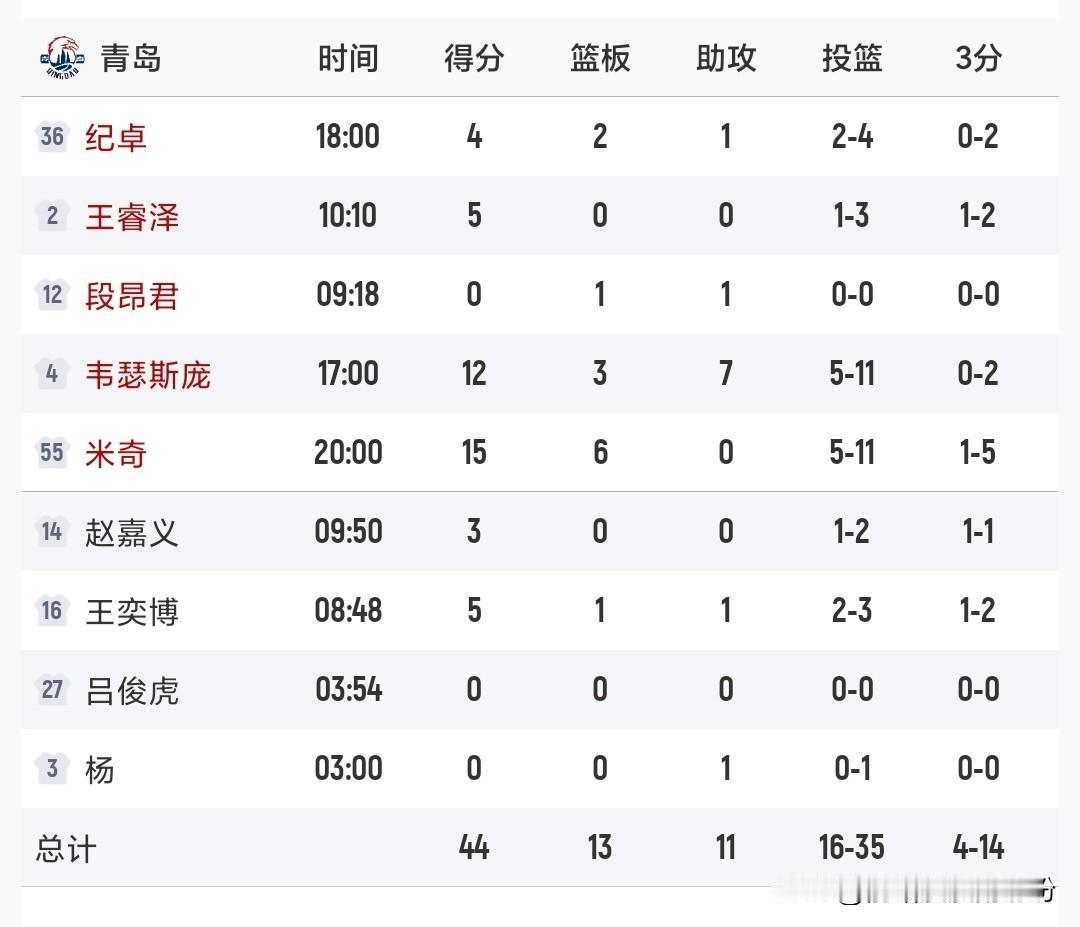 广东宏远取胜问题不大!青岛队完全靠外援! CBA第四轮比赛今晚继续进行,今晚的一场焦点比赛是广东宏远主场对阵青岛,上半场刚结束,广东队暂时以52:44领先。 从上半场比赛的情况来看,青岛队的得分几乎靠外援,两名外援合砍27分,其中韦瑟斯庞得12分3篮板7助攻;另一名外援米奇打满前两节,得到15分6篮板,国内球员无一得分上双,得分最高的是王睿泽的5分。 反观广东队,球队得分分布较平均,徐杰得8分3篮板5助攻,小将王洪泽也有5分3篮板,外援方面奎因手感火热,总投篮6中5,其中3分4中4,砍下17分4篮板和5助攻! 青岛队的这种外援打法撑不到最后一节,广东宏远取胜,问题应该不大。