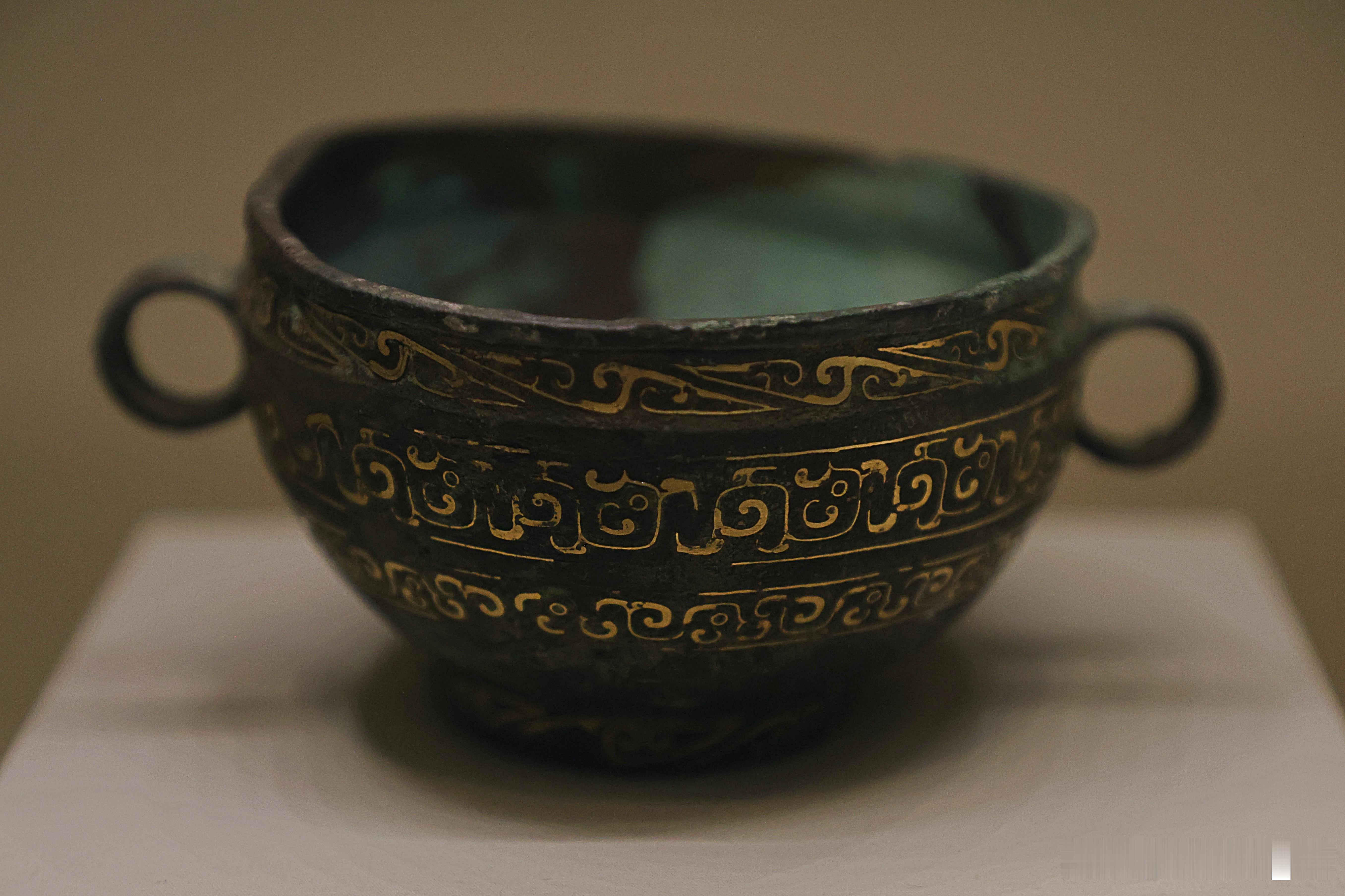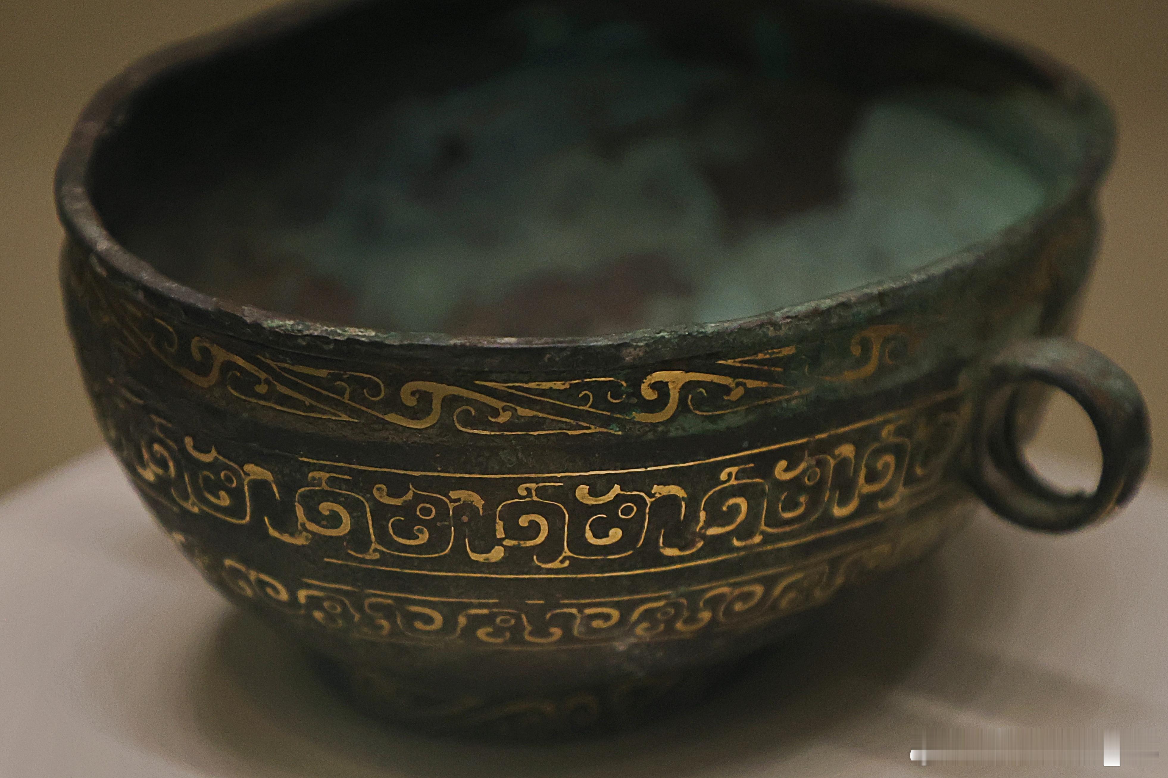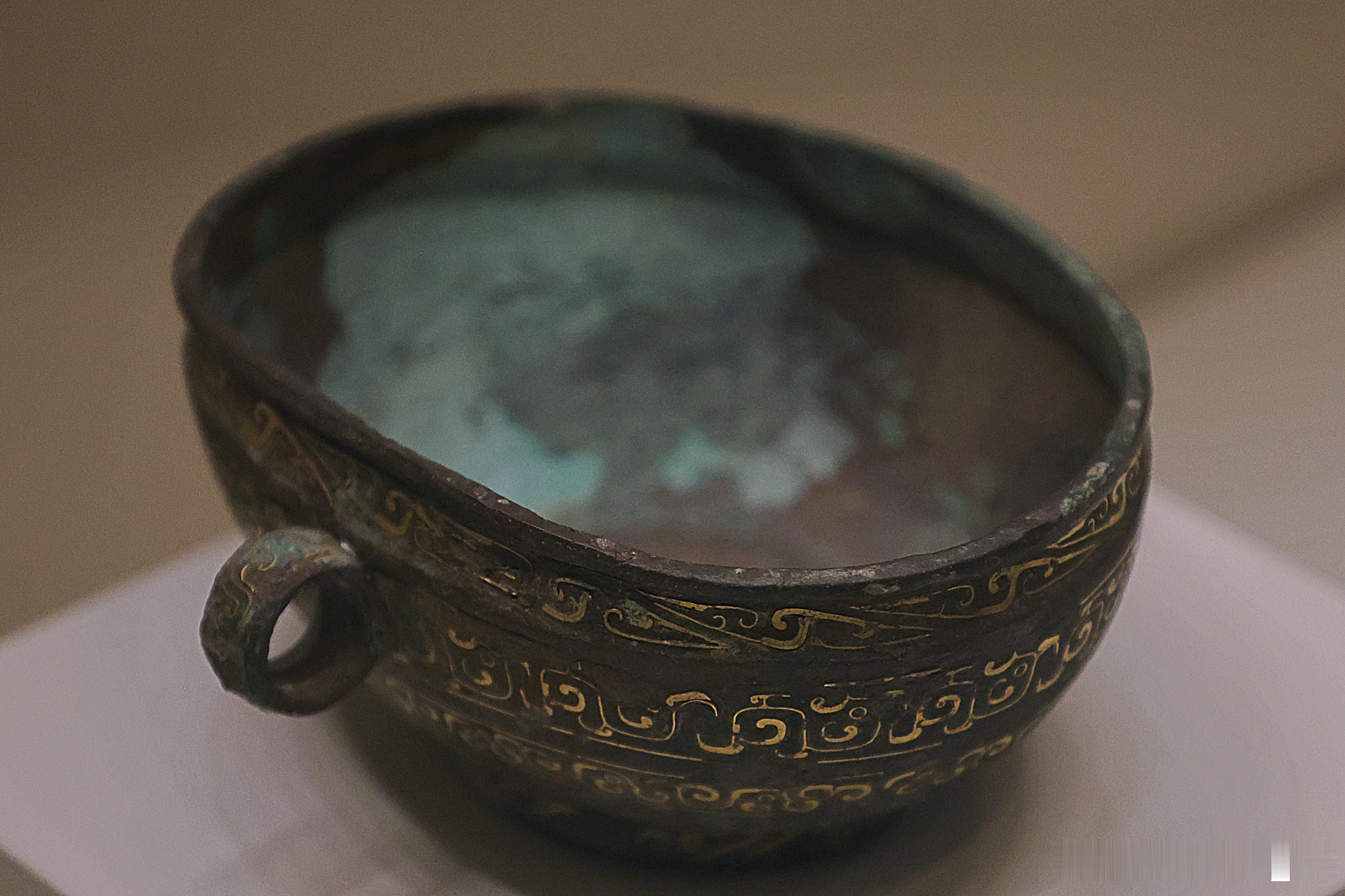 错金青铜鉌 战国 韩 (公元前475-前221年)国家博物馆藏1965年山西长治分水岭出土。鉌是一种饮酒器,大约出现在春秋中期,流行于战国时期。此件鉌出土于长治分水岭126号墓,同时出土的其他文物大都损毁严重,其中包括一件错金纹饰的盖豆。此墓地地处东周的上党地区,曾是赵、韩的势力范围。战国以后此地被认为属于韩地。