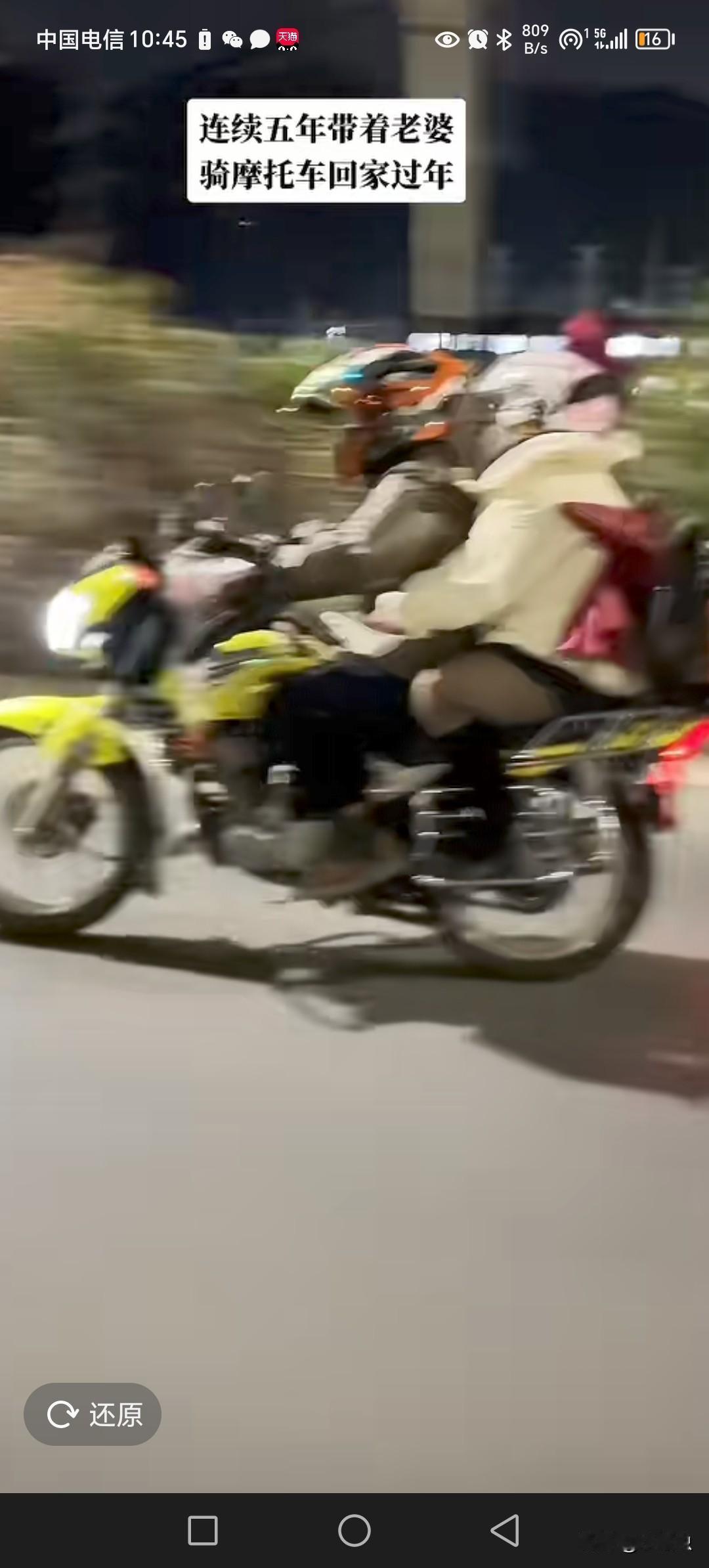 下个月就是返乡潮了,这么多返乡潮。 我最佩服这对夫妻,从浙江温州回贵州老家,一辆摩托车,拉着老婆开了 6天4夜。 这对夫妻除了意力之外,更多就是共同爱好,一般女子这样跑,早就抱怨。 但他们还持续跑了5年,从浙江温州到贵州2450公里,以前春运广西铁骑大军从广东回来觉得够牛掰,跟这比起来都不算什么。 从东部跑去西部,能坚持除了年轻之外,就是思乡的动力。 不过2450公里,开摩托车比自己开车省了不少钱,如果自己开车,高速路费加油费得几千块,这样子一算,每年来回省下来的钱,都可以过个肥年了。 不过不是每个人都能接受这样体力,跟意志力,路途遥远,风险挺大,冰天雪地,疲劳驾驶,开摩托车一天能干到300公里都累到不行。 大多人羡慕他有个好老婆,风雨无阻陪他回家,一般女人,这情况早就叫丈夫买汽车了。