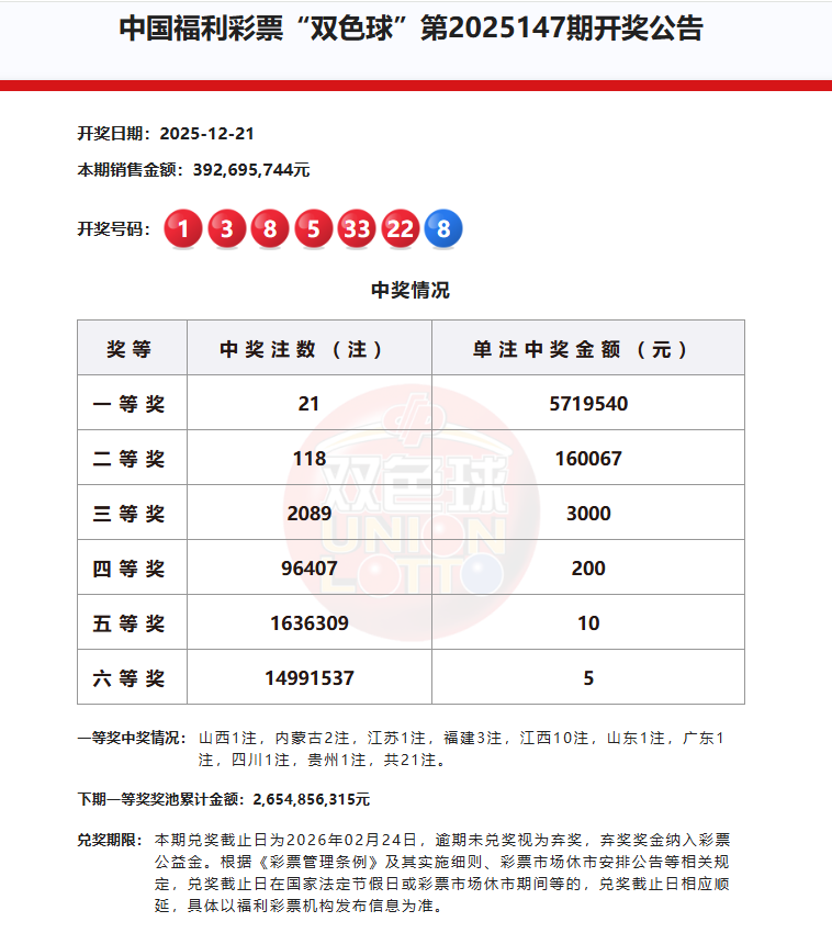 大皖新闻讯12月21日晚,福彩双色球第2025147期开出21注一等奖。一等奖中奖情况:山西1注,内蒙古2注,江苏1注,福建3注,江西10注,山东1注,广东1注,四川1注,贵州1注,共21注。