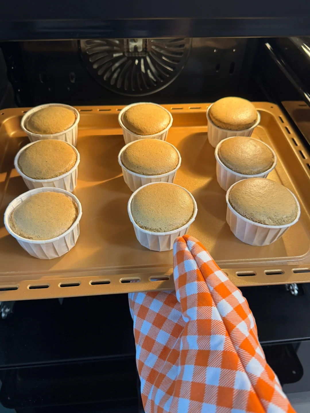 3.烤好后的蛋糕先不要拿出来,在烤箱里焖几分钟(这是不回缩、不塌陷的关键)