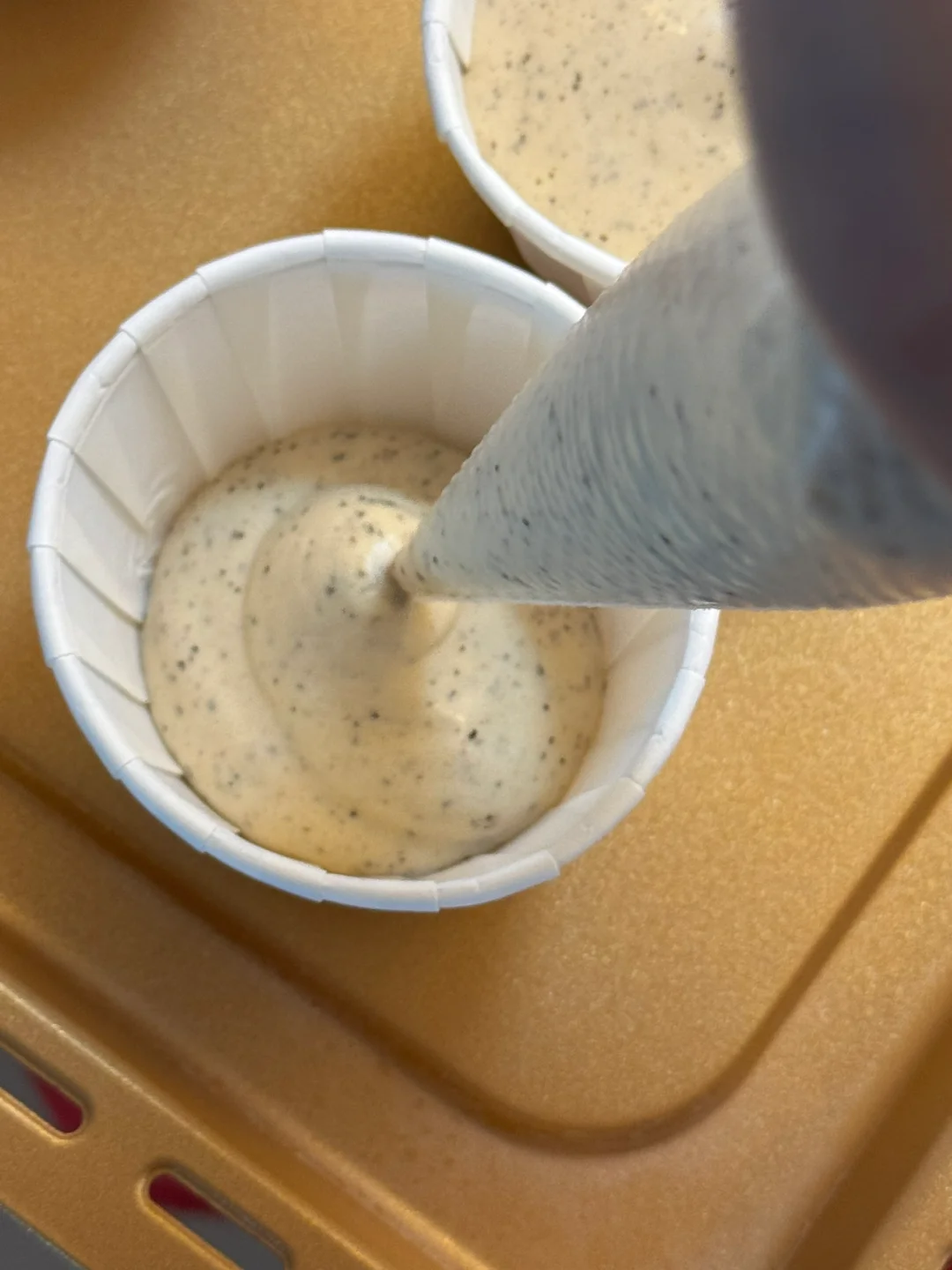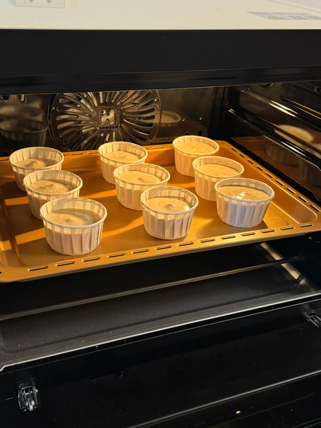 5.蛋糕糊装入裱花袋挤入纸杯中8分满左右。