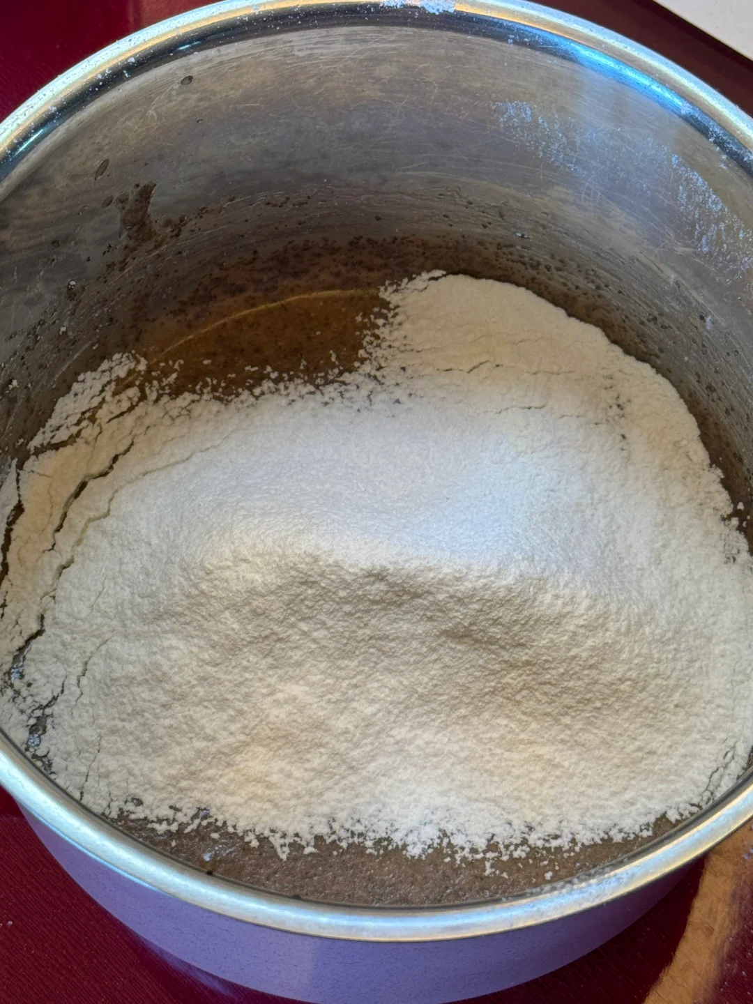 2.加入过筛后的低筋面粉,z字形搅拌至无干粉加入蛋黄,搅拌至顺滑。