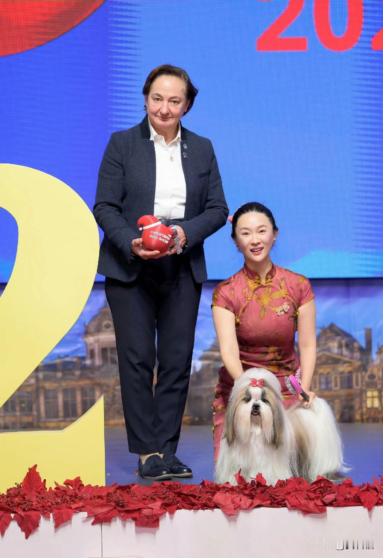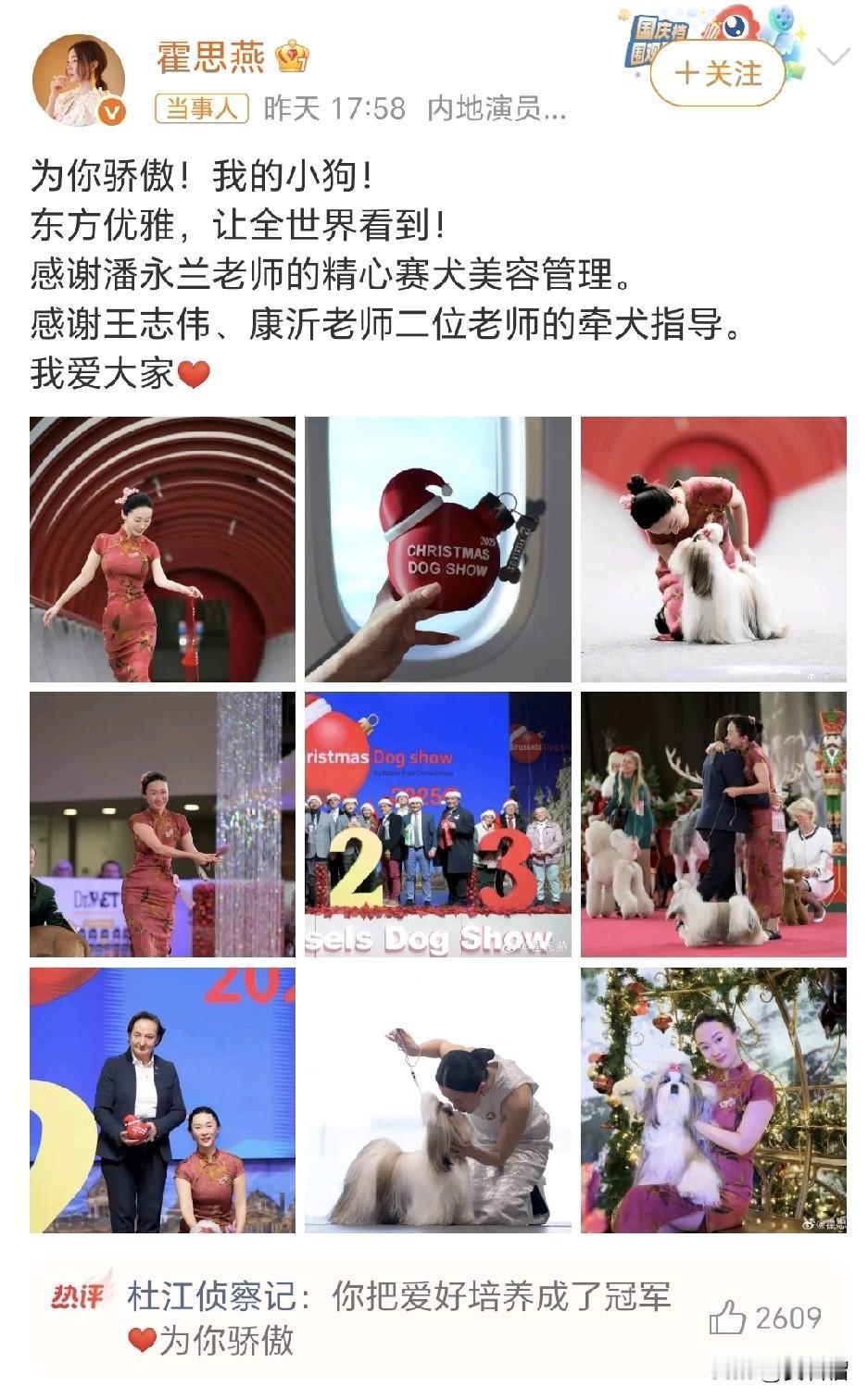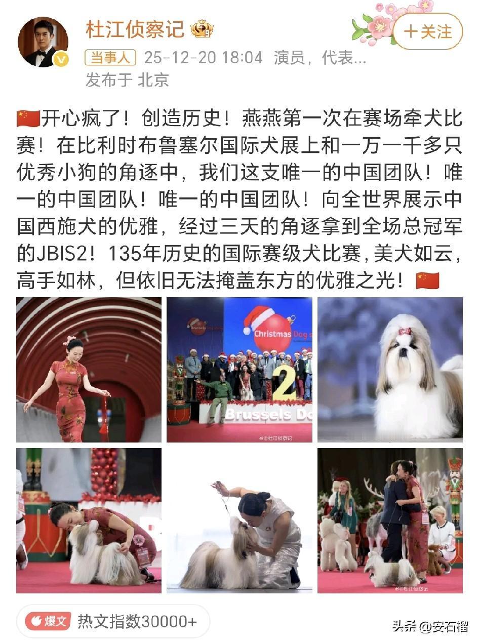 也太厉害了吧!霍思燕把爱好培养成了冠军! 霍思燕+西施犬=宠物届的“为国争光”! 一袭红韵旗袍勾勒东方韵味,头顶五星红旗蝴蝶结的西施犬昂首挺胸,霍思燕带着爱犬霍香香征战有135年历史的比利时国际犬展,在全球万余只名犬中杀出重围,一举拿下总冠军!作为全场唯一的中国团队,她亲自担当训犬师,与狗狗的默契配合惊艳全场,连老公杜江都激动连发三次“唯一的中国团队”刷屏庆祝。这场兼具中式美学与荣耀时刻的比赛,不仅是中国原生犬种在国际舞台的高光亮相,更藏着他们对小动物十年如一日的温柔守护,难怪网友直呼“这才是最提气的文化输出”!