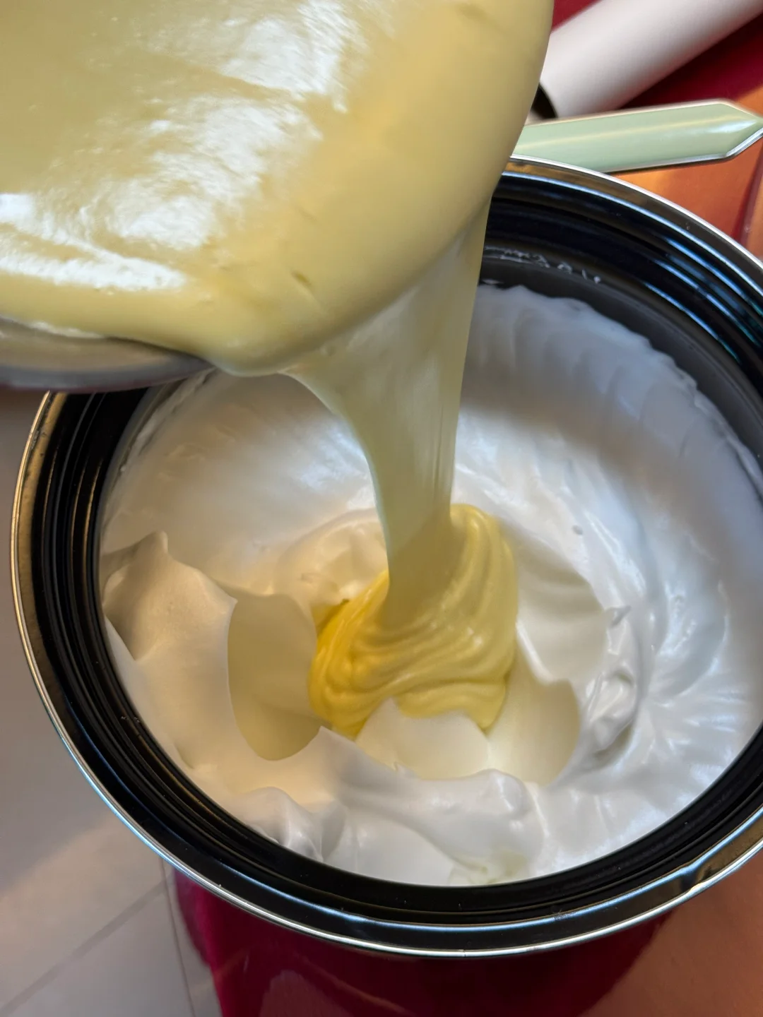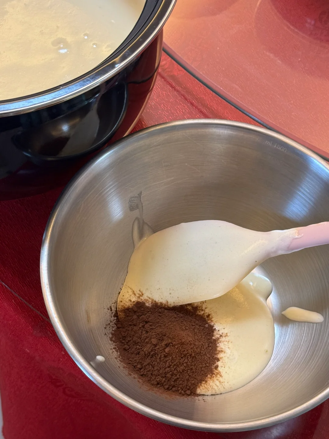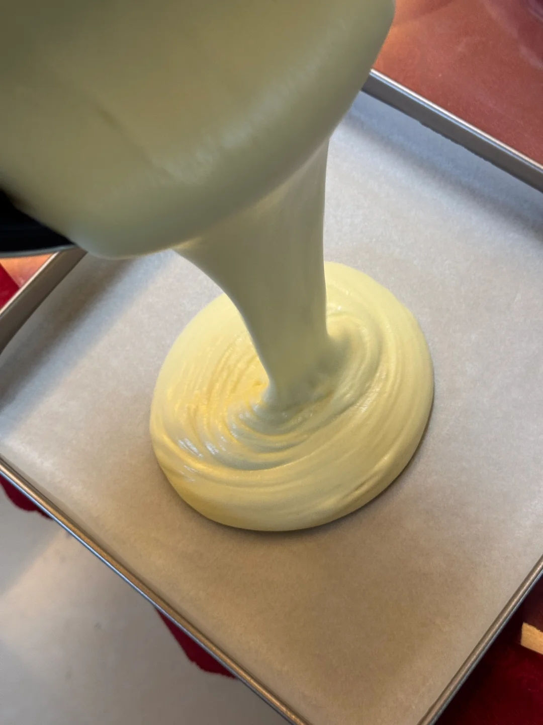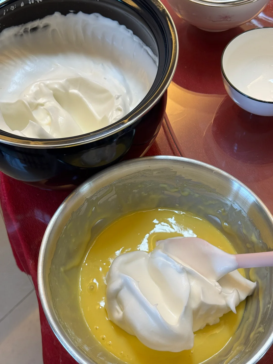 4.取一部分蛋白霜与蛋黄糊翻拌均匀,再倒回蛋白霜中翻拌均匀,倒入烤盘(从高处倒)留一点面糊与可可粉混合均匀,装入裱花袋。