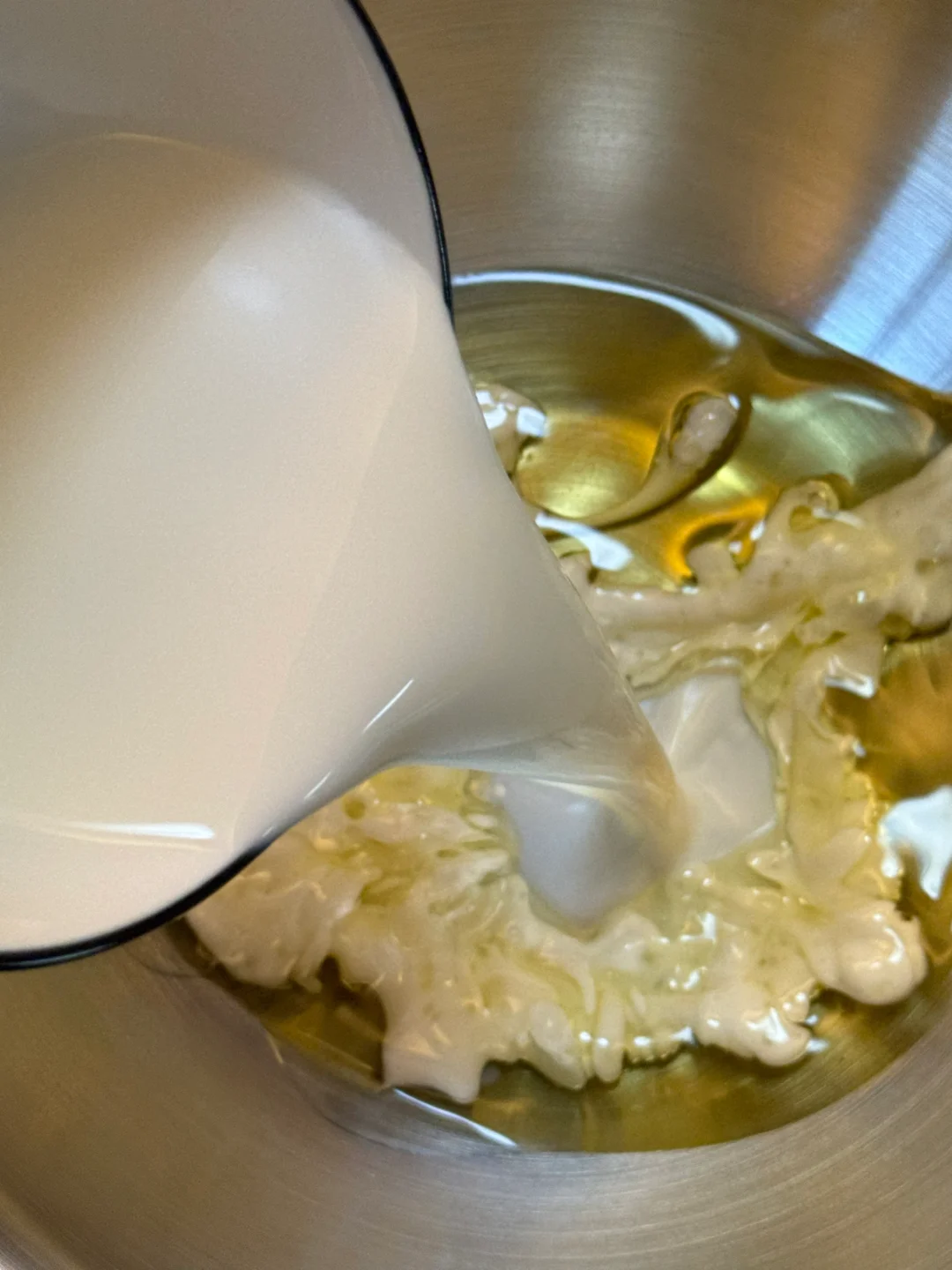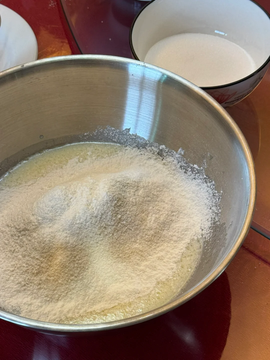 1.玉米油、纯牛奶充分搅拌乳化,筛入低筋面粉搅拌至无干粉。