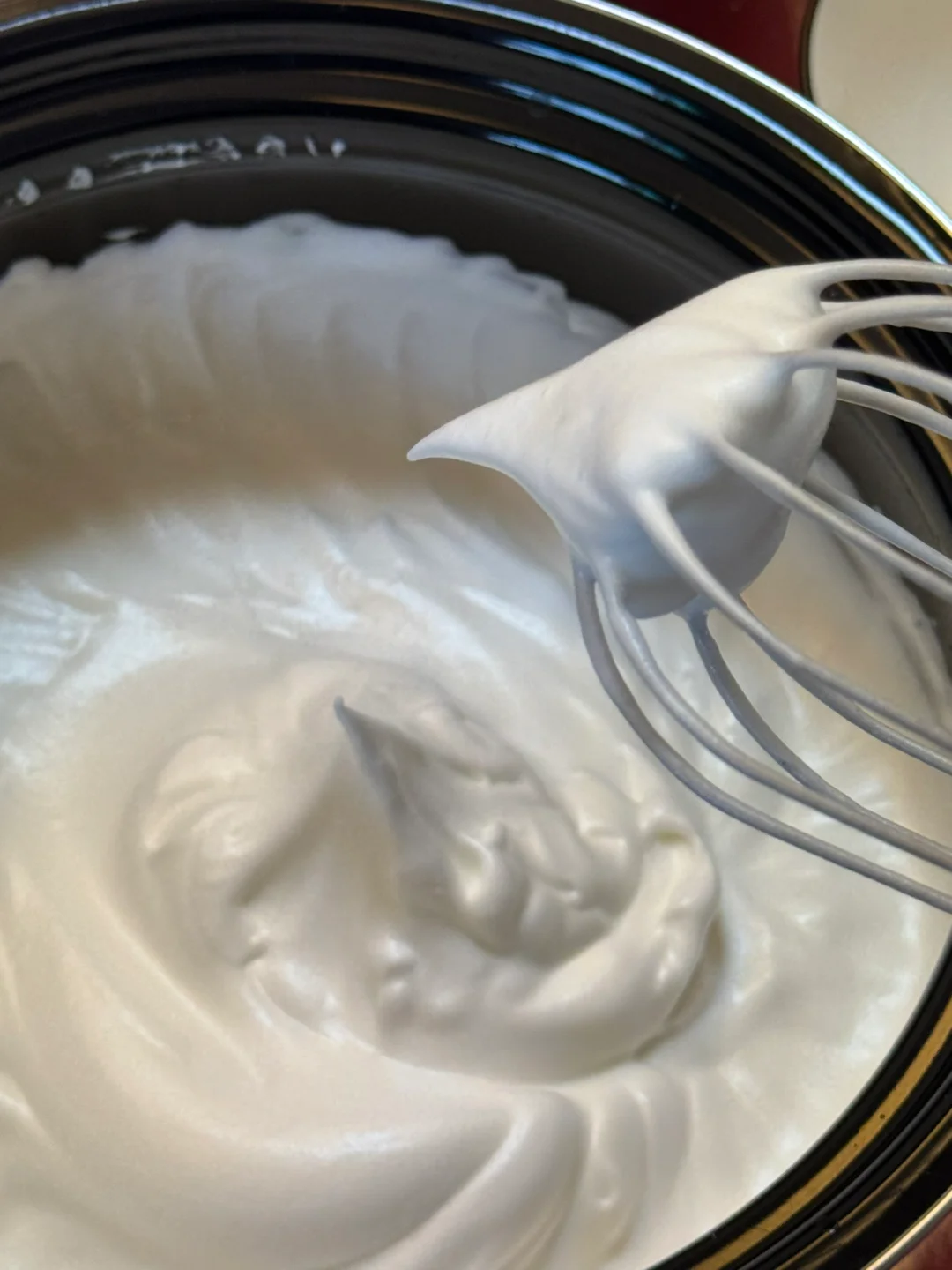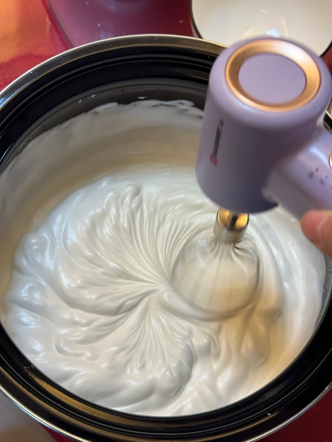3.蛋清中加入细砂糖、柠檬汁,打发至有纹路状态后加入玉米淀粉,打发至提起有小弯钩。