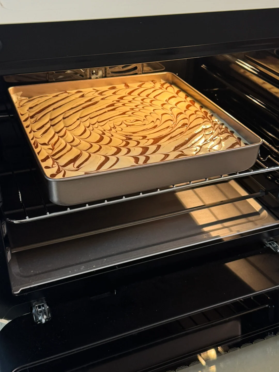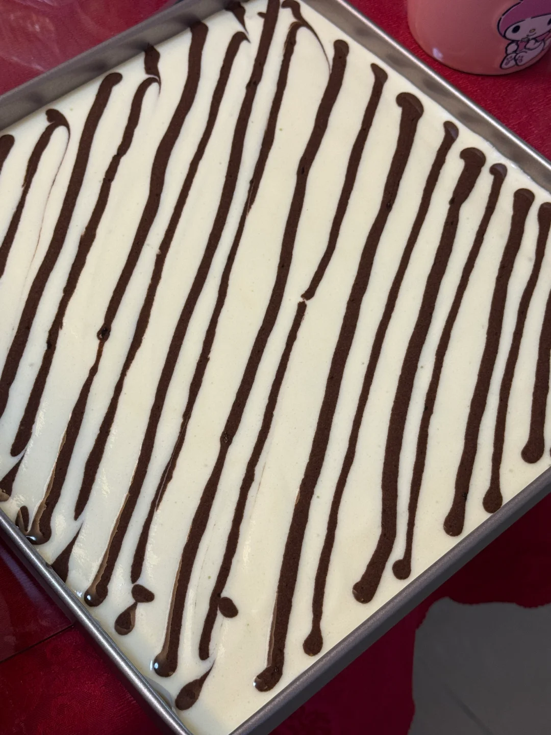 5.用竹签消除气泡,轻震几下,挤出条纹状,用竹签划出好看的纹路,烤箱提前预热,135度烘烤20分钟,转140度烘烤40分钟,出炉震出热气,放凉后切掉四边,切成块状。