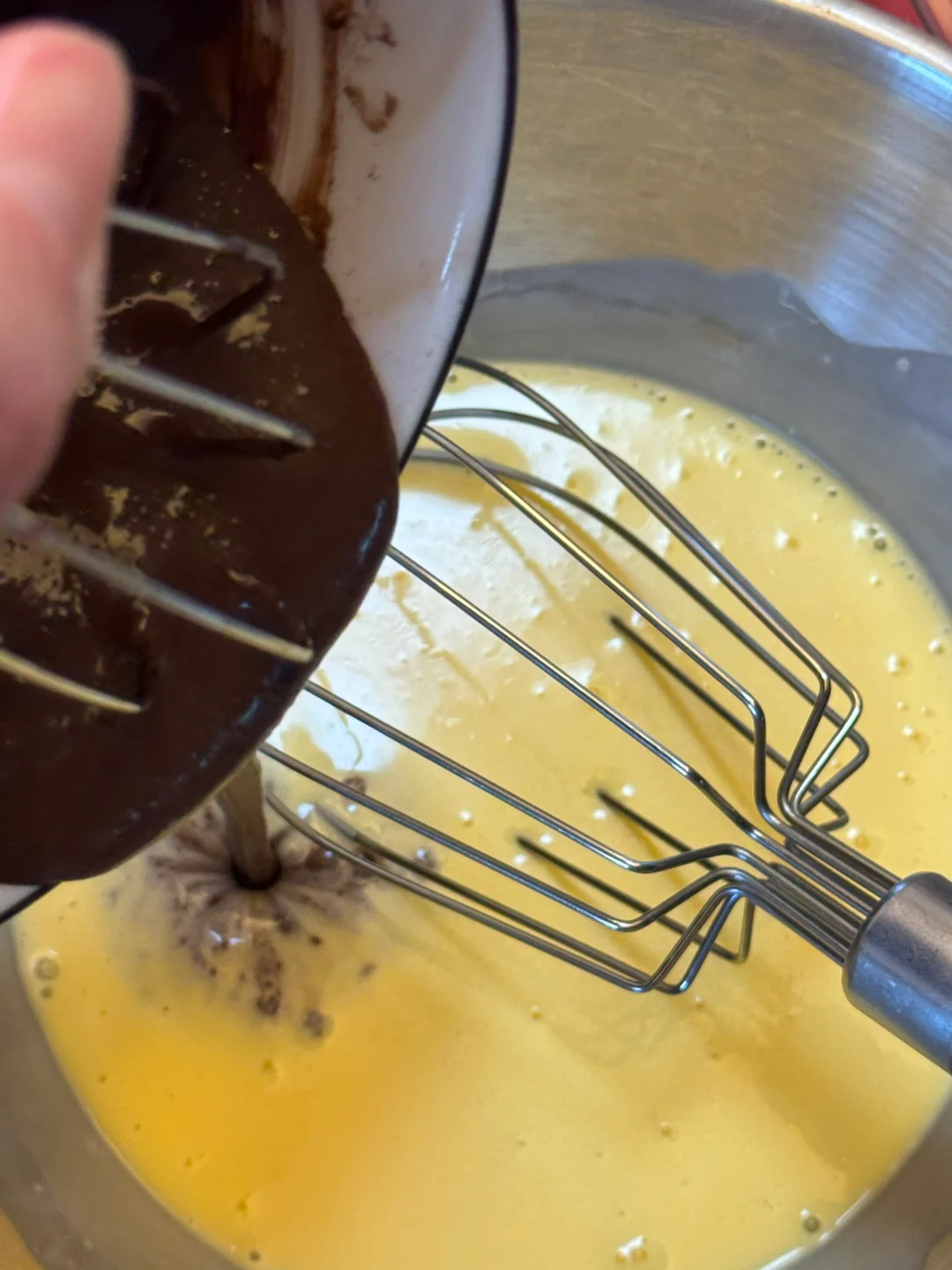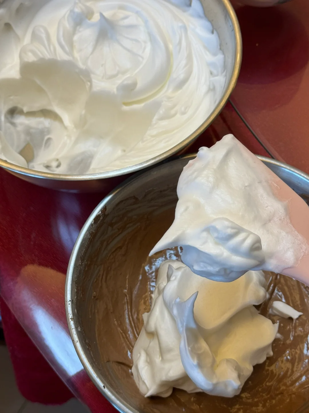2.剩下的淡奶油与可可液、蛋黄搅匀,筛入低筋面粉搅拌至顺滑。