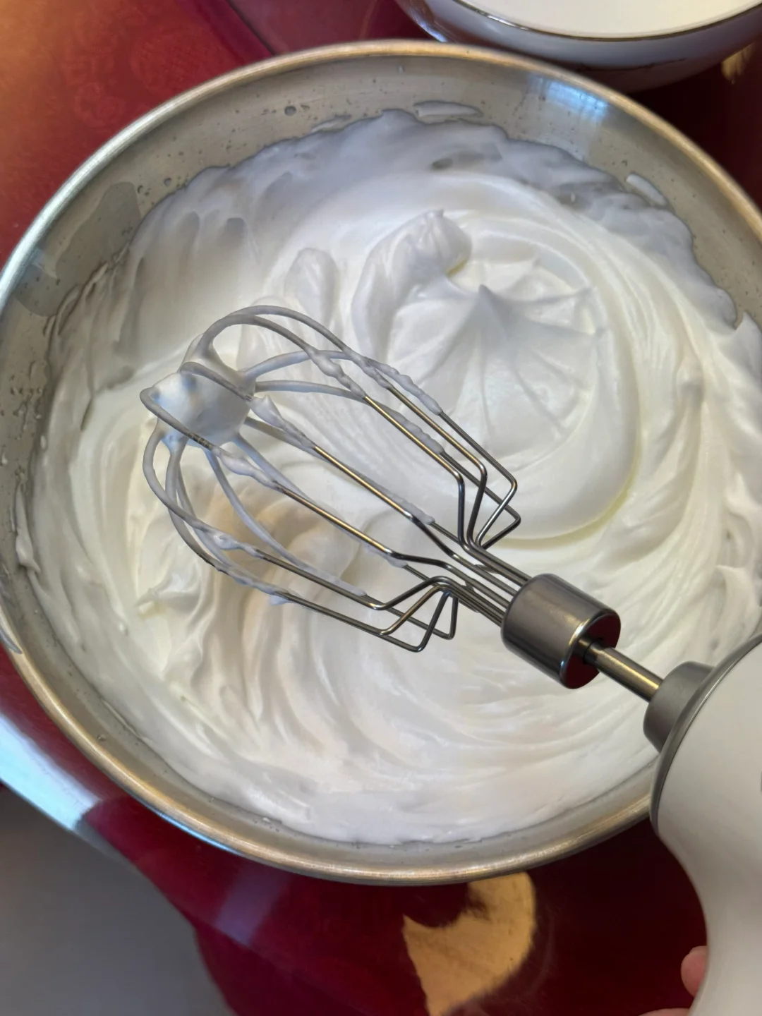 3.蛋清加入细砂糖、柠檬汁打发至小弯钩状态。