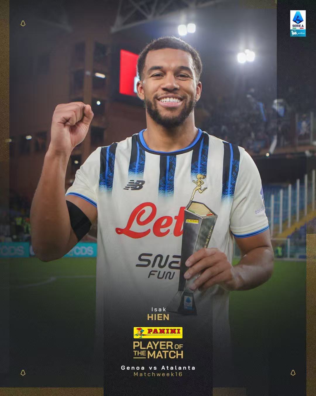 虎扑12月21日讯意甲联赛第十六轮,亚特兰大客场1-0战胜热那亚。亚特兰大后卫希恩首发登场,在补时阶段贡献头球绝杀,帮助亚特兰大带走三分。赛后,他被意甲官方评选为全场最佳球员。