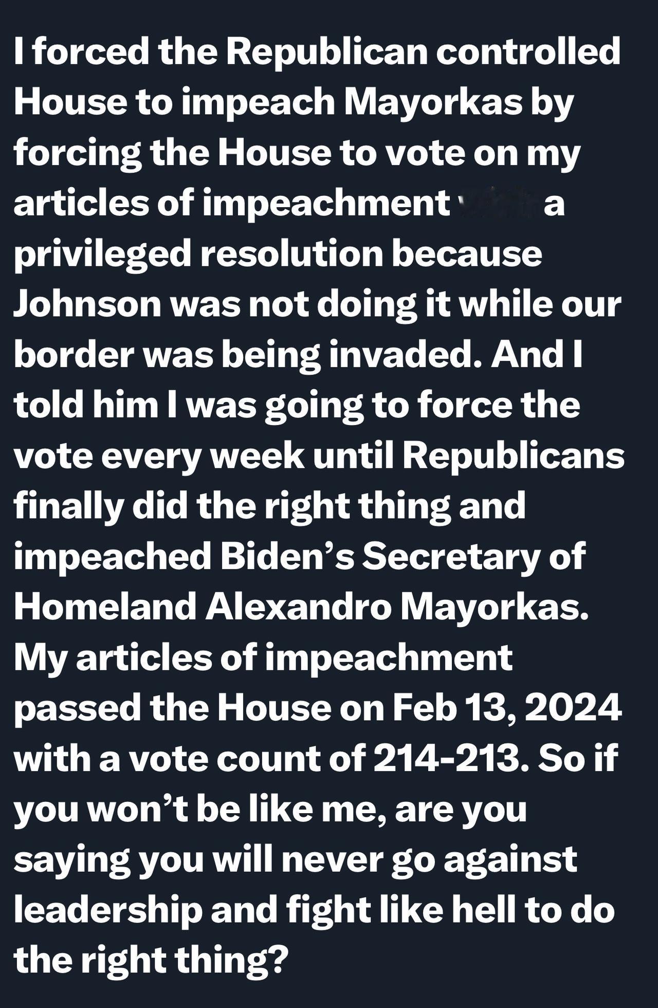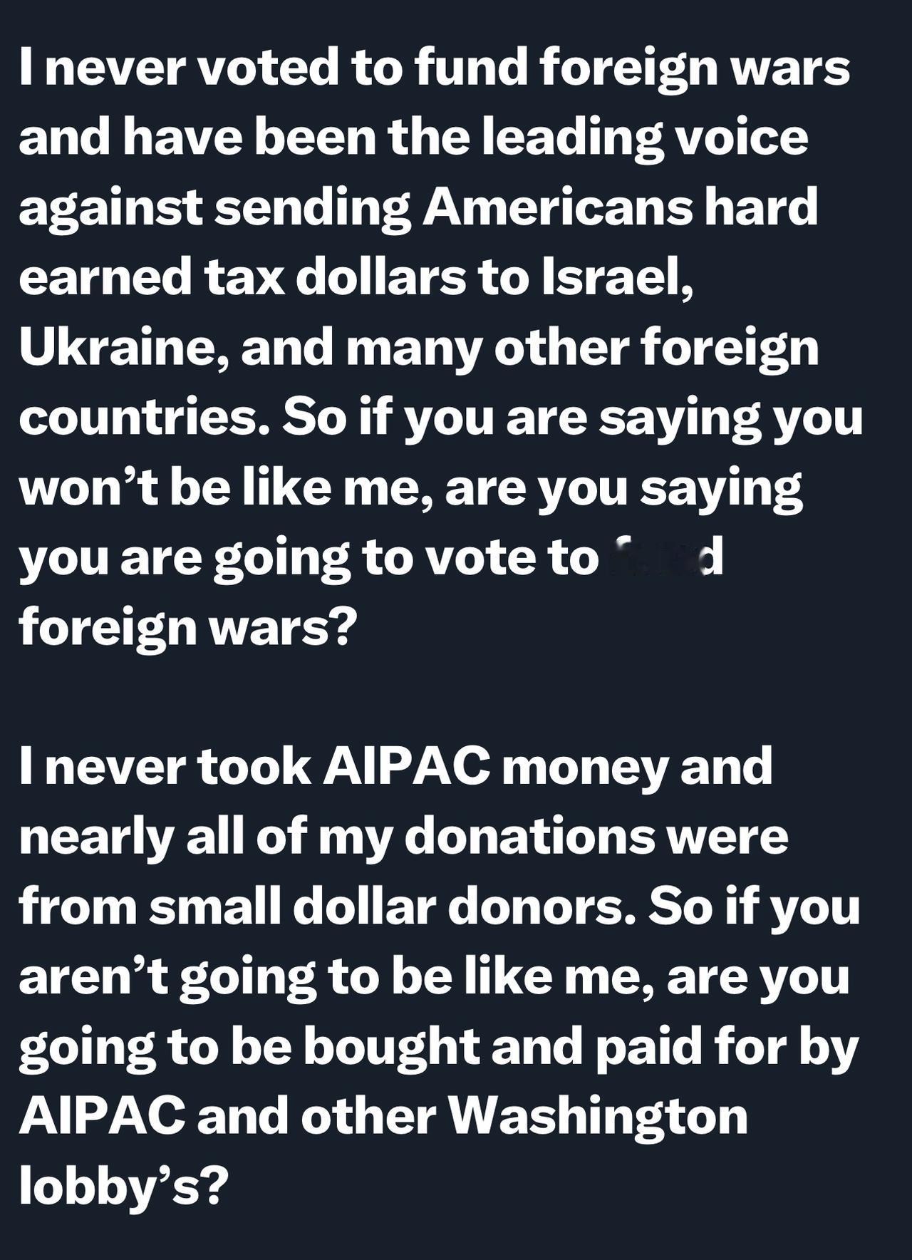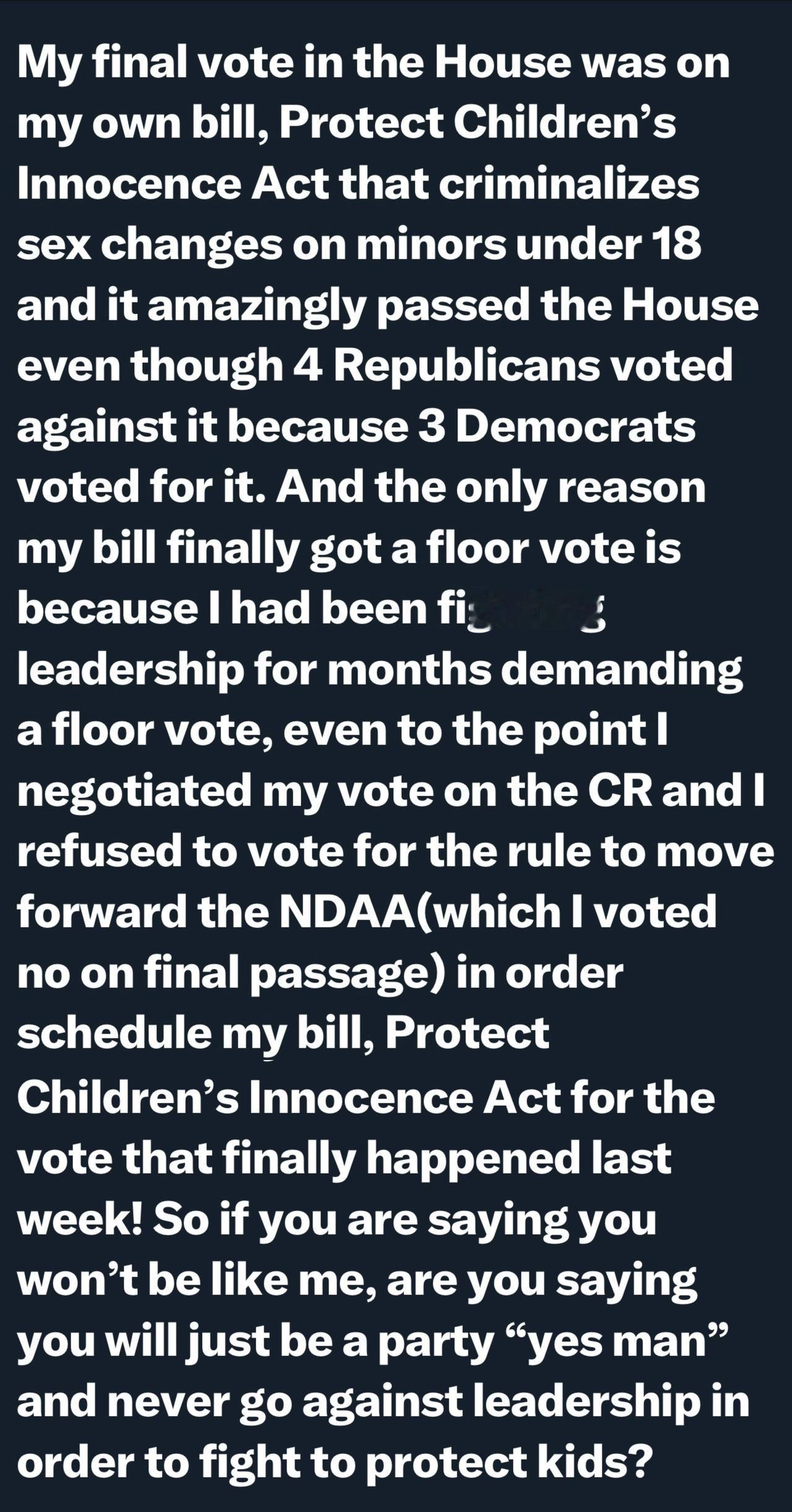 美国乔治亚州众议员玛乔丽.泰勒.格林发帖: “乔治亚州第14选区(GA-14)的国会特别选举正在进行中,以填补我留下的空缺。我听到一位潜在的共和党候选人说“我不会像MTG那样”,这句话的意思如下。 我是仅有的四位签署请愿书的共和党人之一,这份请愿书旨在迫使众议院就一项法案进行投票,该法案旨在迫使政府公开爱泼斯坦的档案,以声援那些在少女时期遭到强奸、受害并被贩卖给权贵的女性。正因如此,特朗普称我为叛徒,但我仍然拒绝退缩,因为我将与强奸受害者站在一起,反对任何人,即使是我曾帮助并力挺他当选总统的人。所以,如果你说你不会像我一样,那么你是说,即使在掩盖强奸未成年少女的罪行和保护精英阶层的问题上,你也会对总统唯唯诺诺吗? 我的选区办公室在帮助选民方面有着堪称最佳的记录之一,而服务选民正是我最珍视的职责之一,也是我工作中最重要的部分。所以你的意思是,你不会像我一样去帮助退伍军人、老年人和有需要的选民吗?因为我就是这么做的。 我也相信拨款程序,并一直努力确保选区的拨款申请被纳入众议院的拨款法案,这样我的选区居民才能看到他们辛辛苦苦缴纳的税款回到家乡,用于帮助他们自己的社区。所以,如果你不是说你不会像我一样,那么你是说你不会帮助选区的纳税人获得他们急需的拨款吗? 我迫使共和党控制的众议院通过一项特权决议,就我的弹劾条款进行投票,从而迫使众议院弹劾马约卡斯。因为约翰逊在我们边境遭到入侵时却无所作为。我告诉他,我会每周都迫使众议院进行投票,直到共和党人最终做出正确的决定,弹劾拜登的国土安全部长亚历山德罗·马约卡斯。我的弹劾条款于2024年2月13日以214票对213票在众议院获得通过。所以,如果你不愿意像我一样,你是说你永远不会反对领导层,永远不会拼死去做正确的事吗? 我在众议院的最后一票是投给我自己提出的《保护儿童纯真法案》的,该法案将对18岁以下未成年人进行变性手术定为刑事犯罪。令人惊讶的是,尽管有4名共和党人投了反对票,但由于有3名民主党人投了赞成票,该法案最终还是在众议院获得通过。我的法案之所以最终能够进行全体投票,完全是因为我几个月来一直在与领导层抗争,要求进行全体投票,甚至不惜与他们协商,在持续拨款决议(CR)中投反对票,并且拒绝投票支持推进《国防授权法案》(NDAA)(我在最终通过该法案时投了反对票),以确保我的《保护儿童纯真法案》能够进行投票,而最终投票在上周举行!所以,如果你说你不会像我一样,你是说你只会做一个党内的“好好先生”,永远不会为了保护儿童而与领导层作对吗? 我从未投票支持资助对外战争,而且一直是反对将美国人辛辛苦苦挣来的税款输送给以色列、乌克兰和其他许多外国的主要倡导者。所以,如果你说你不会像我一样,那你是说你会投票支持资助对外战争吗? 我从未接受过美国以色列公共事务委员会(AIPAC)的捐款,我的捐款几乎全部来自小额捐赠者。所以,如果你不想像我一样,难道你要被AIPAC和其他华盛顿游说团体收买吗? 2020 年,我与 8 位资历深厚的候选人竞争,并在没有特朗普支持的情况下击败了他们所有人,因为我竞选国会议员是为了代表佐治亚州第 14 选区的民众,而不是华盛顿的沼泽地,不是外国,也不是做一个“应声虫”。 如果你要竞选接替我的位置,你最好为人民服务,告诉他们你将如何代表他们,而不是你将如何向白宫和共和党领导层卑躬屈膝。 这场竞选关乎你,而不是我;这个职位是人民的代表,而不是你、总统或共和党的代表。”