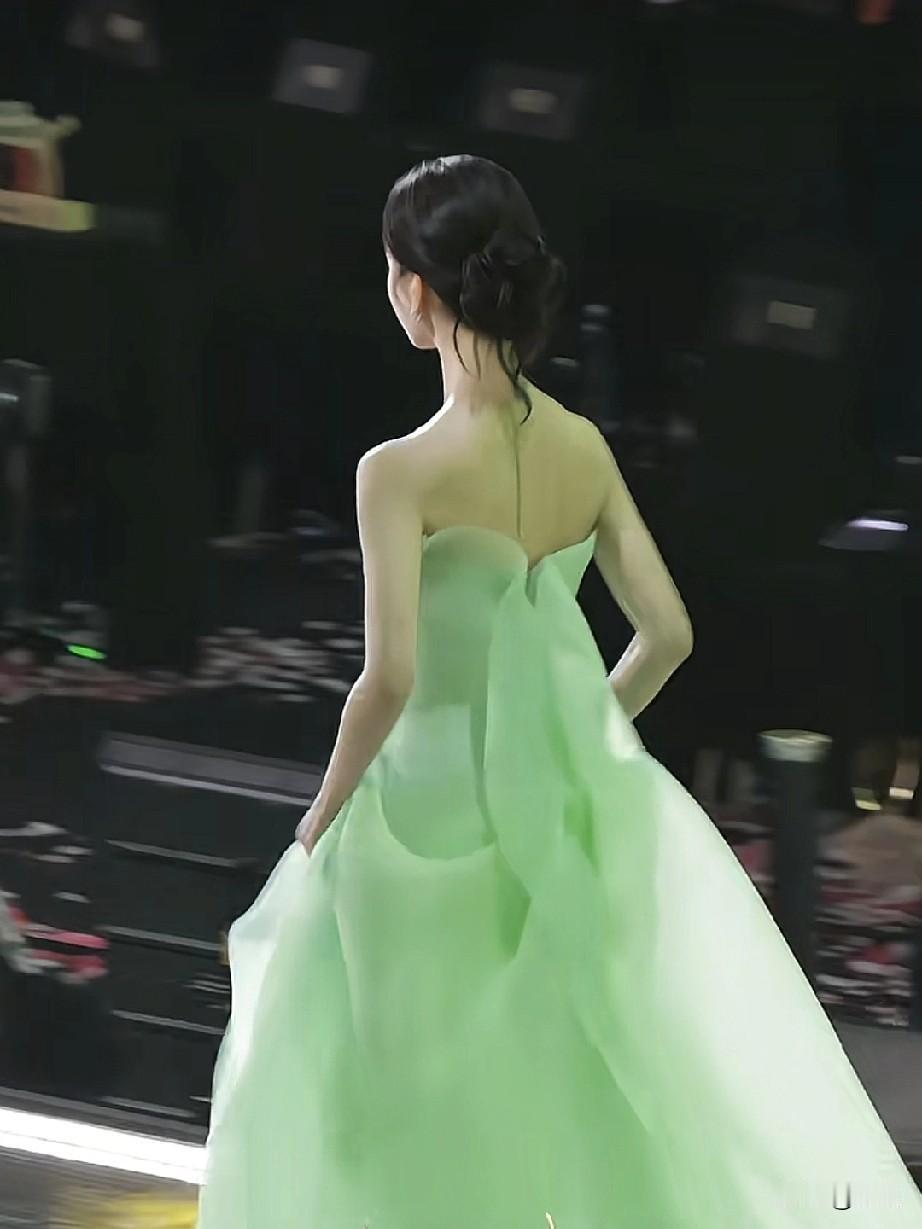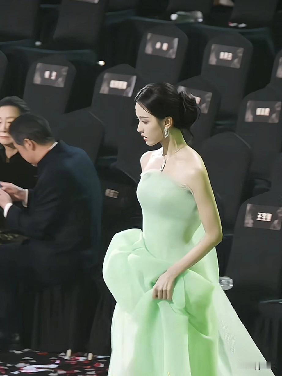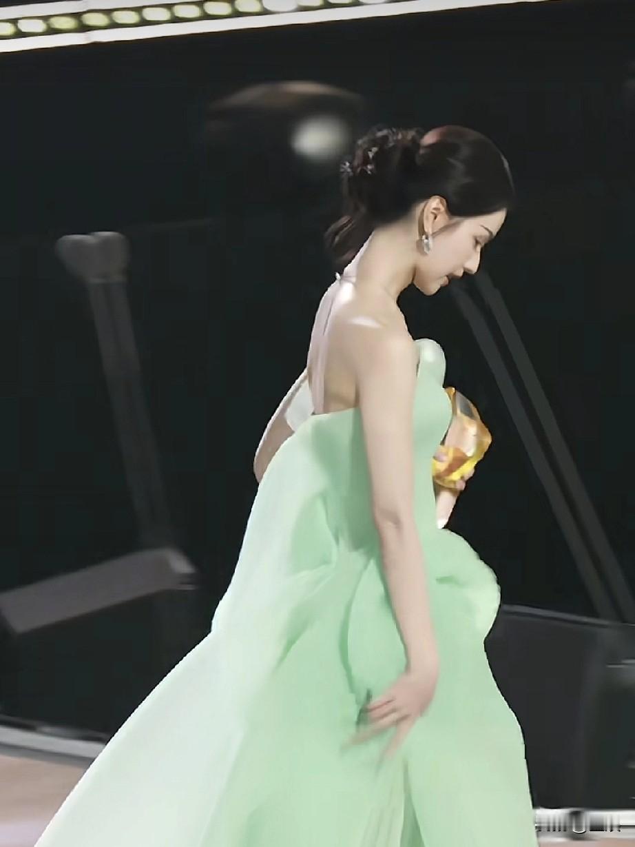 陈都灵身着一袭清新的浅绿色礼服,手持奖杯站在舞台的麦克风前,在参加某个颁奖典礼或活动,在进行获奖后的发言。你是想了解这场活动的更多信息,还是对她的礼服造型感兴趣呢?
