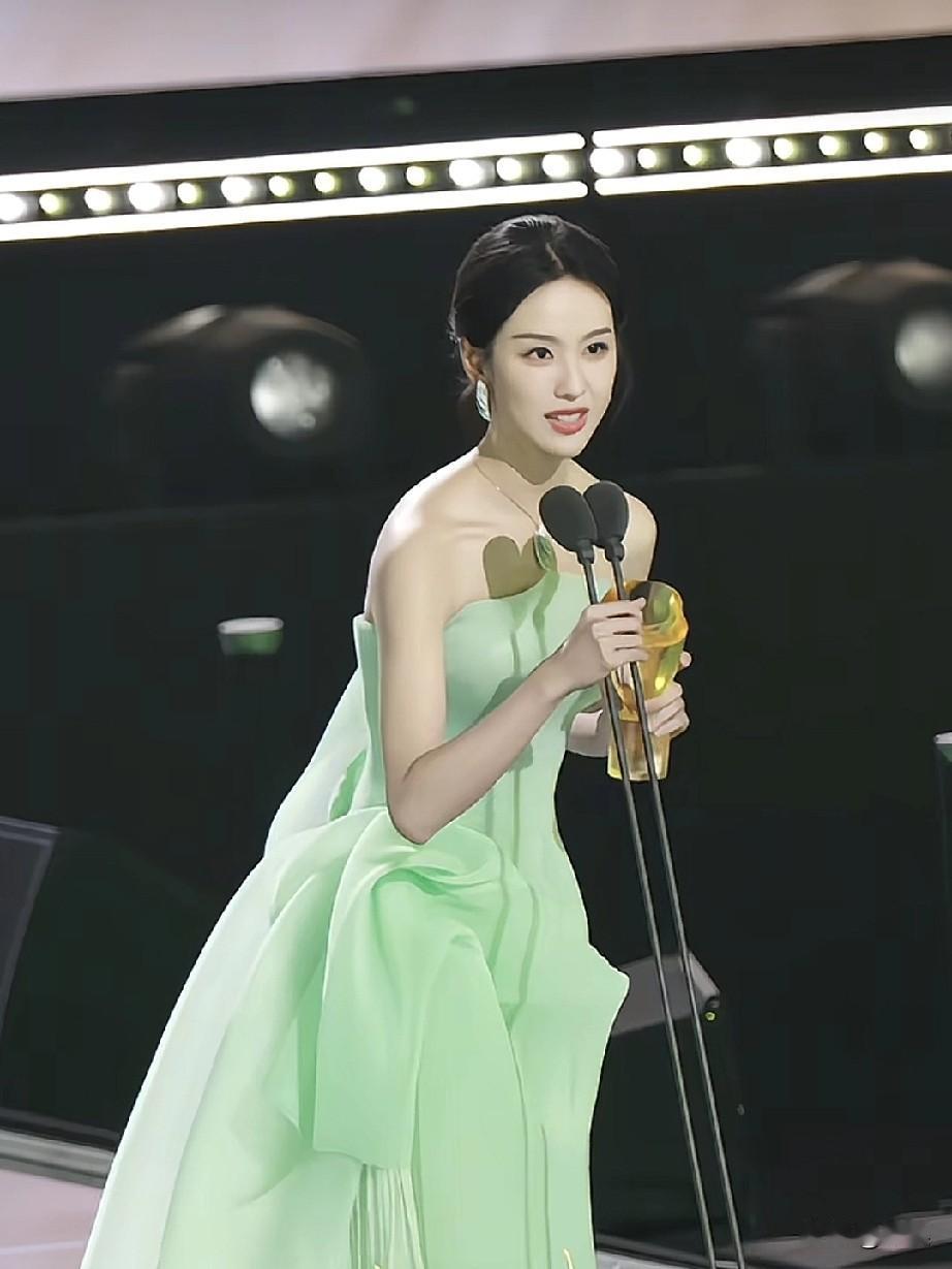 陈都灵身着一袭清新的浅绿色礼服,手持奖杯站在舞台的麦克风前,在参加某个颁奖典礼或