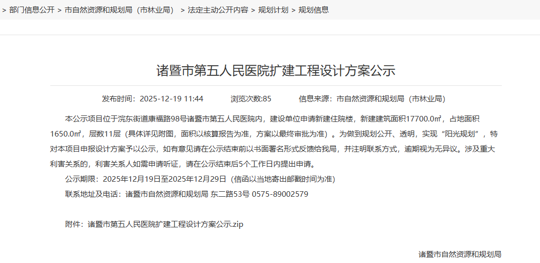 绍兴诸暨市第五人民医院扩建工程设计方案公示