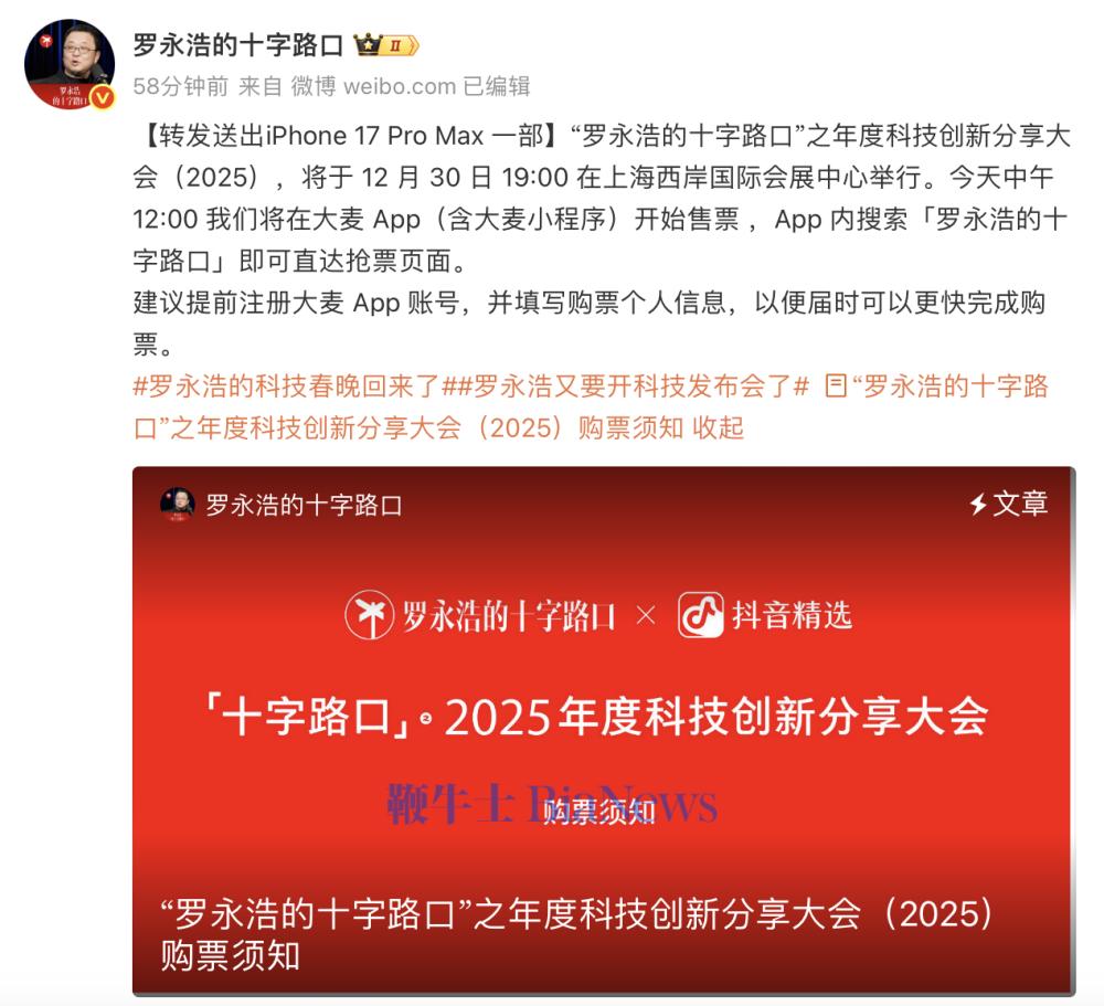 12月22日,罗永浩宣布,“罗永浩的十字路口”之年度科技创新分享大会今天中午12:00在大麦App开始售票。