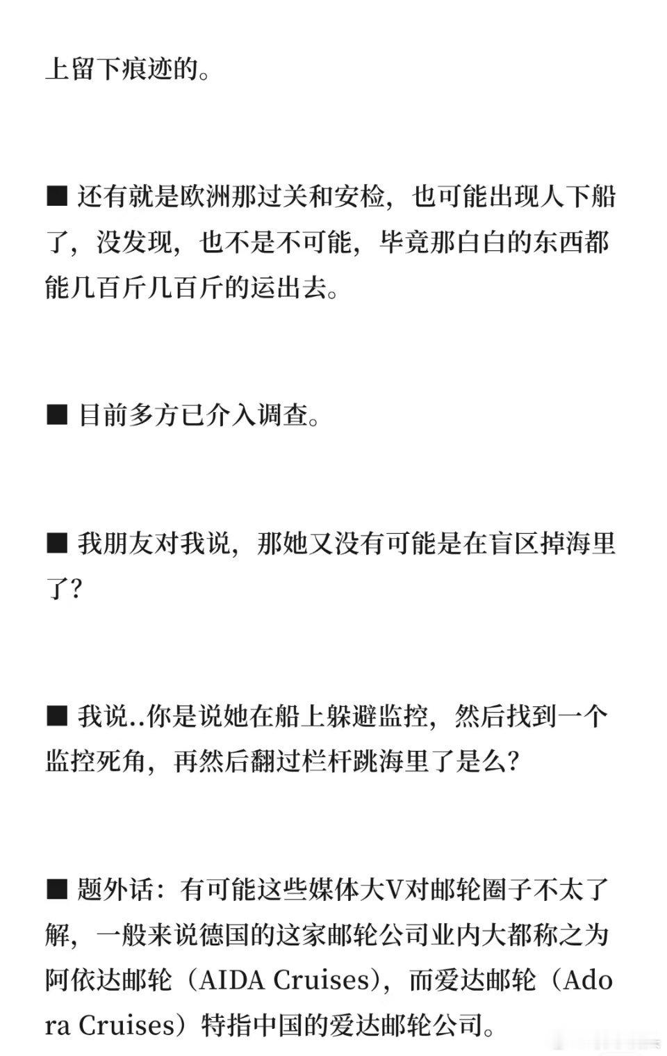 中国女子在欧洲邮轮上人间蒸发人不可能莫名其妙地人间蒸发,希望能够积极调查,看看究竟是什么个情况?