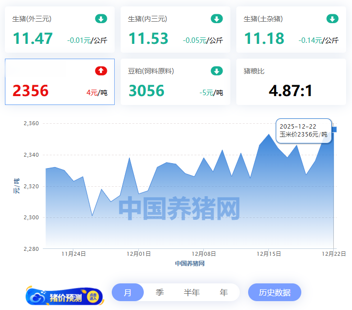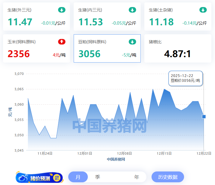 全国(生猪品种:内三元)均价为11.53元/公斤,猪价较昨日下跌0.05元/公斤,环比下跌2.45%,同比下跌26.33%;