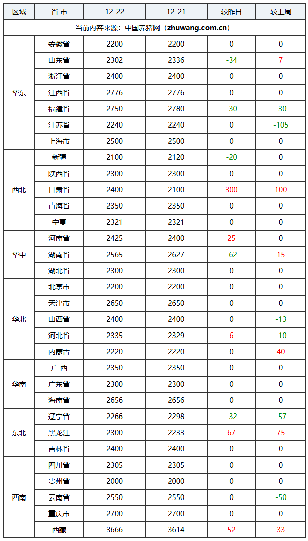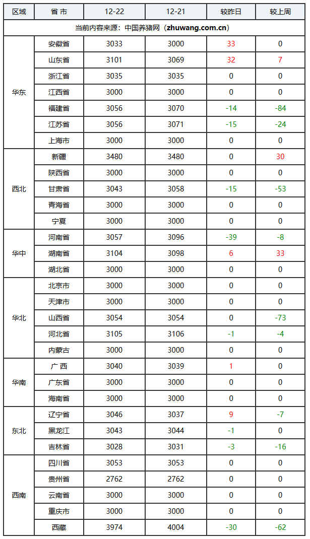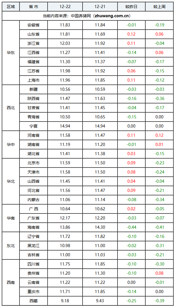 猪价上涨地区(11个):山东省、浙江省、江苏省、上海市、河南省、湖北省、北京市、天津市、河北省、广西壮族自治区、山西省、青海省、湖南省;上涨区间:0.02-0.12元/公斤;