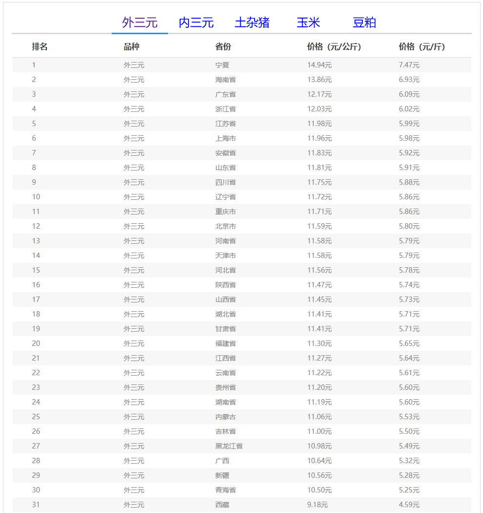 外三元排行前三:宁夏回族自治区14.94元/公斤、海南省13.86元/公斤、广东省12.17元/公斤;