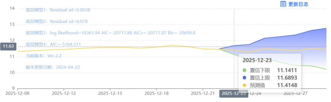 玄田算法是由项目课题组团队原创的非经典逻辑数值聚合理论和不确定性预测方法,构建了基于一致模算子的生猪价格预测模型。该模型采用的聚合函数及一致模相关理论与方法已获得多项国家自然科学基金和省级自然科学资金资助,并获得多项省级自然科学奖奖项。12月23日预测猪价为11.4148,置信区间在11.1411--11.6893之间。12月24日预测猪价为11.2837;12月25日预测猪价为11.5092。