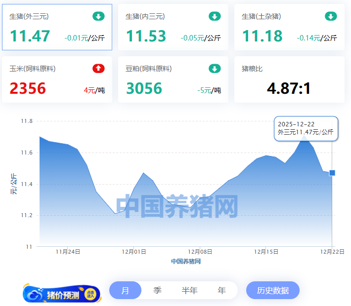 全国(生猪品种:外三元)均价为11.47元/公斤,猪价较昨日下跌0.01元/公斤,环比下跌1.71%,同比下跌24.49%;