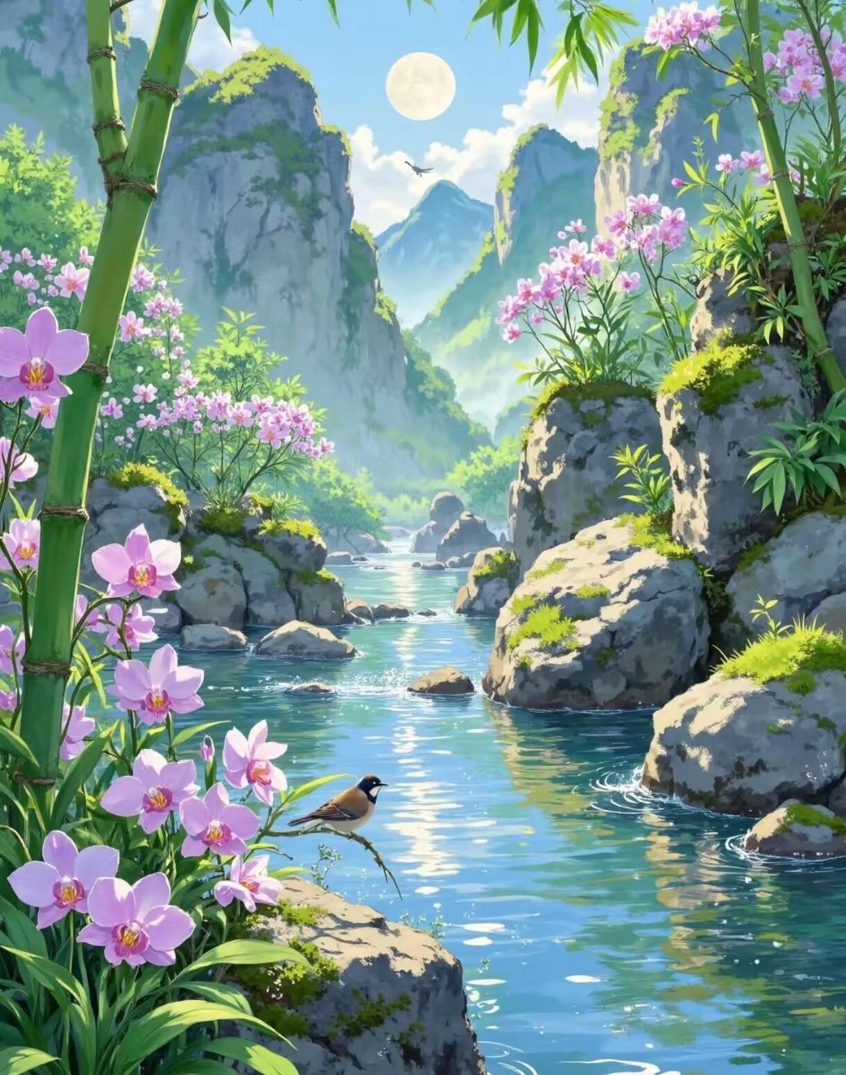 抬头望月,月不语; 低首问花,花无言。 横批:《花与月》