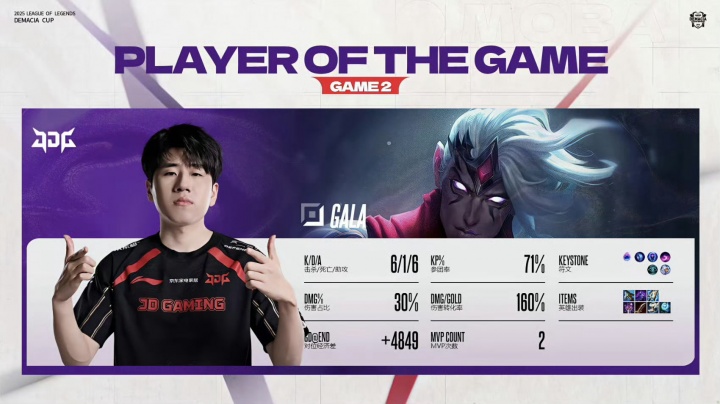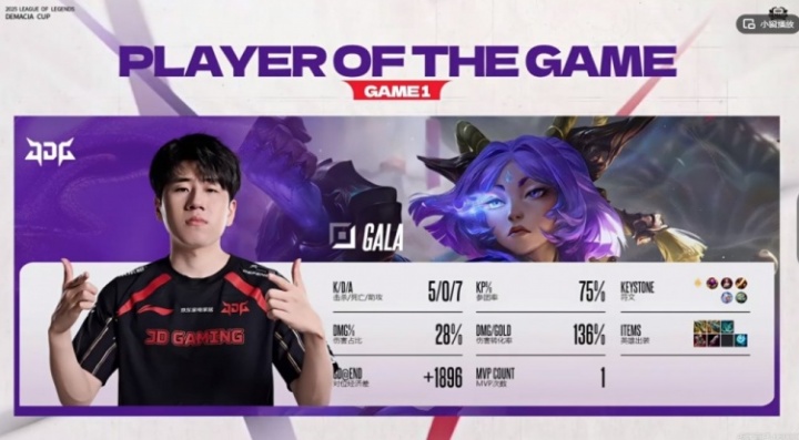 直播吧12月22日讯今日德杯上JDG击败OMG拿下胜利,而队内选手GALA也凭借出色发挥拿到二连MVP,在本场BO3中GALA使用芸阿娜打出5-0-7的数据;第二局维鲁斯打出6-1-6的数据,两局比赛战绩合计11-1-13!