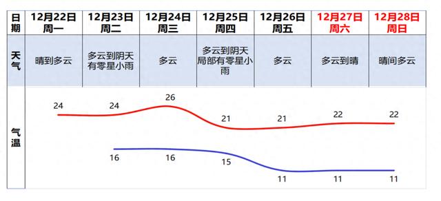 12月22日,市防汛防旱防风总指挥部办公室与市气象局对广州市的气象水文情况进行了会商。会商结论指出,预计,22日,受弱冷空气影响,晴间多云,气温小幅下降,陆地阵风加大至4级左右,港区和高地阵风6级左右;23日至24日,零星小雨转多云,气温回升;25日起,受冷空气持续补充影响,多云转晴,昼夜温差大,早晚寒凉。广州市区天气具体预报如下: