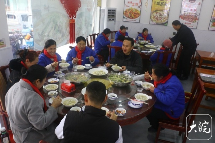 大皖新闻讯12月20日,在阜南县城王店路临街的一家饭店,80后小伙张凯宴请10名环卫女工吃热气腾腾的猪肉水饺。送上保温杯围脖手套护手霜等7件御寒物品。“天这么冷,环卫工人起早贪黑对街道社区进行保洁,他们很辛苦。”12月22日,张凯告诉大皖新闻记者,请他们吃顿饭,感谢他们辛勤付出。