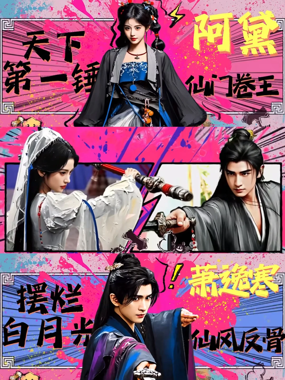 鞠婧祎饰演的“仙门卷王”阿黛(娇小双马尾少女)与张云龙饰演的“慵懒师尊”萧逸寒形成极致反差。阿黛以五把玄铁巨锤为武器(从小到大刻有古朴纹路),杀青特辑中“扛锤杀敌后整理双马尾”的桥段强化“萌系狠人”标签;萧逸寒则慵懒随性,两人在AR技术加持的花瓣雨打戏中硬核过招,被观众称为“对抗路情侣天花板”。