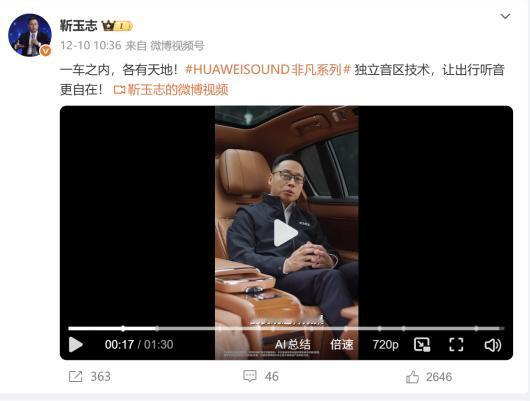 从“共享”到“独享”,华为乾崑重塑车内声音空间 从“共享”到“独享”,华为乾崑如何重塑车内声音空间?华为乾崑智能汽车解决方案BU CEO靳玉志微博科普来了! 你有没有遇到过这样的尴尬?家人想在车里听摇滚,你却想安静听播客。孩子后排看动画片,前排导航提示音却混作一团。传统车载音响的声场是“共享”的,声音四处扩散,互相干扰。但华为乾崑智能汽车解决方案BU CEO靳玉志最新展示的HUAWEI SOUND非凡系列独立音区技术,彻底打破了这种限制。 按照靳玉志的解析,这些技术的核心在于“控制声场”。为每个座位配备了自研的声学隧道头枕,单个头枕内竟集成4个扬声器,如同在耳畔建起“专属音乐包厢”。而且头枕通过特殊结构与阻尼材料,精准调控声波相位,并生成反相声波主动抵消外泄声音。独创的声场控制算法,能调动全车扬声器协同工作,形成一道无形的“声学屏障”。系统还会根据乘客坐姿与位置实时动态调校,让声音牢牢锁定在聆听者周围。 如此一来,前后排真正实现“同车不同音”,不仅解决多人乘车的需求冲突,也让每个人都能在旅途中拥有自己的声音天地。如果大家想了解更多智能出行的前沿突破,可以关注靳玉志的微博,我看分享的内容,都还蛮值得看的。 华为乾崑 HUAWEI SOUND