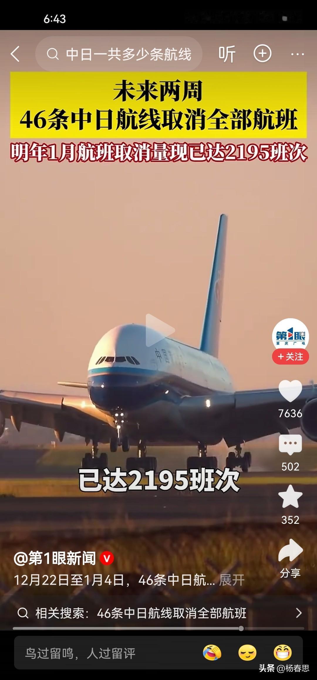 中日关系继续恶化的迹象。中日航班未来两周再次取消46班次。中国航班一共是有一百七十多,目前没有完全取消,取消百分之四十几。 按航空数据机构Cirium统计,中日间定期航线共176条(连接日本20个、中国大陆36个机场,不含港澳台)结合2026年1月数据推算,当月中国大陆赴日原计划约5433班次,截至12月22日已取消2195班次,取消率40.4%。 我个人支持国家的决定啊,是吧。在这敏感时期,国家利益大于个人利益,那些还想去日本的。你们想去就去,当然到时候你们也可以回来,你们既然有能力去,就有能力回来是吧?大不了你们可以转口美国啊,转口东南亚再飞回来吧。
