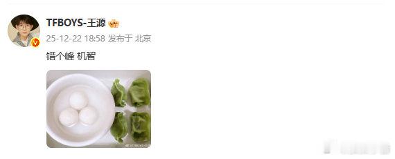 王源错峰过冬至 冬至错峰营业!昨日冬至,今日他上线发出一碗汤圆和几个绿绿的饺子,