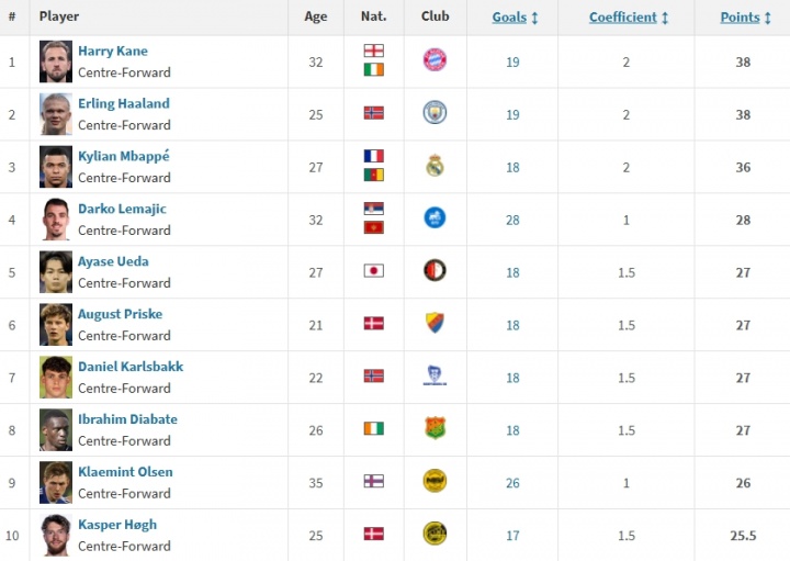 直播吧12月22日讯本轮联赛比赛结束,哈兰德梅开二度,凯恩、姆巴佩各入一球。目前,在2025/26赛季欧洲金靴实时排名上,凯恩以38分领跑,哈兰德位列第二,姆巴佩第三。