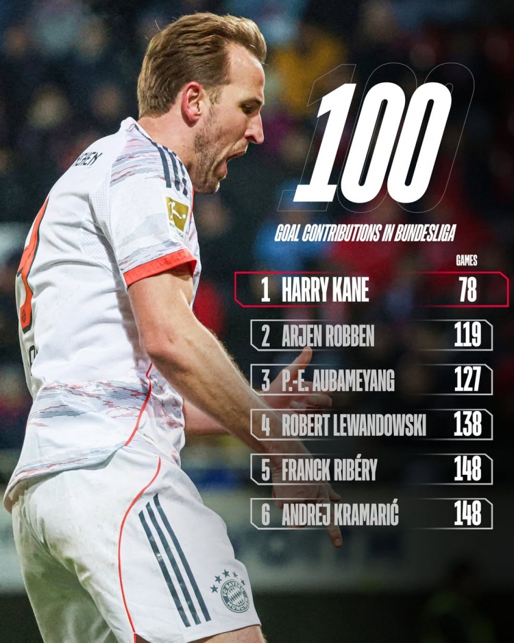 拜仁官方社媒晒出德甲联赛中达成参与100球所需场次榜单,其中凯恩78场居首。