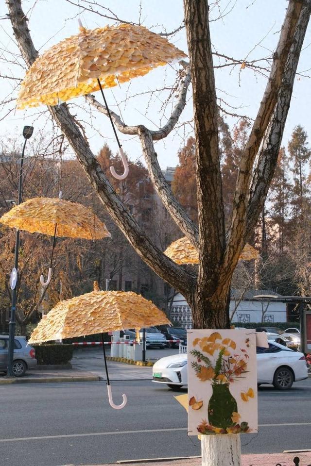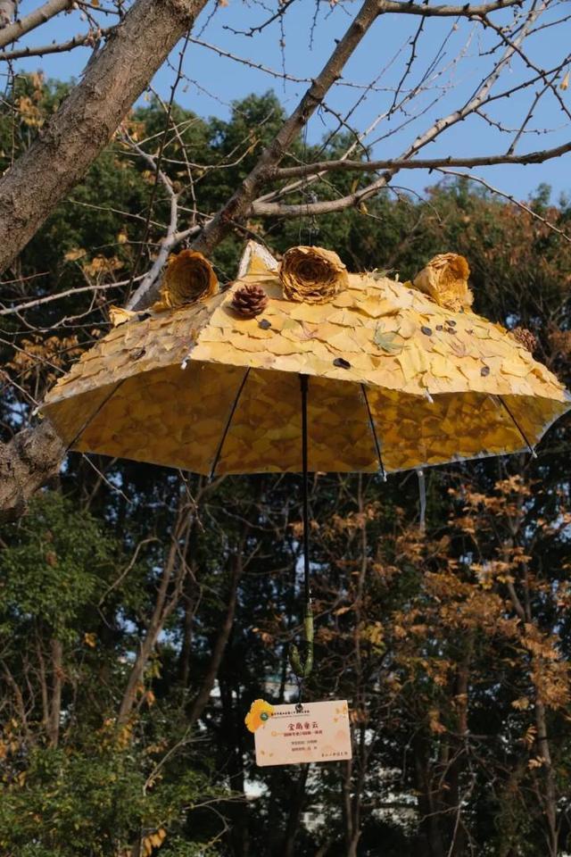 最近,萧山区城厢街道城河公园办起了银杏艺术展,银杏叶被制作成了雨伞、相框、魔法帽等十几组装置,摆在公园里,灵动有趣。不少市民专程过来打卡,还和装置互动了起来。