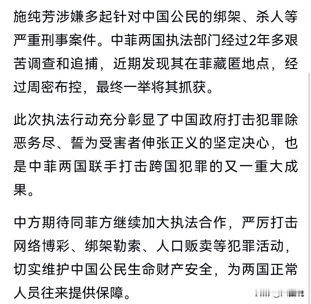 这男人怎么起了个女人名。 12月22日,中菲合作抓获并遣返施纯芳。 这个犯罪分子非常的很恶劣啊,涉嫌多起针对中国公民的绑架杀人案。 真是罪大恶极呀。 确实要好好的合作,将那些犯罪分子抓获归案。 虽然菲律宾总是在南海闹事。 但是该有的合作还是要有,像这种打击罪犯。 最好是国与国,全世界的国家一起联手。